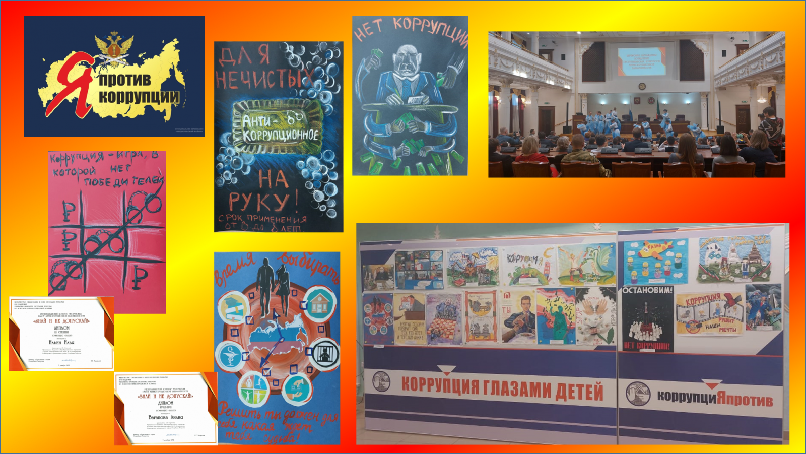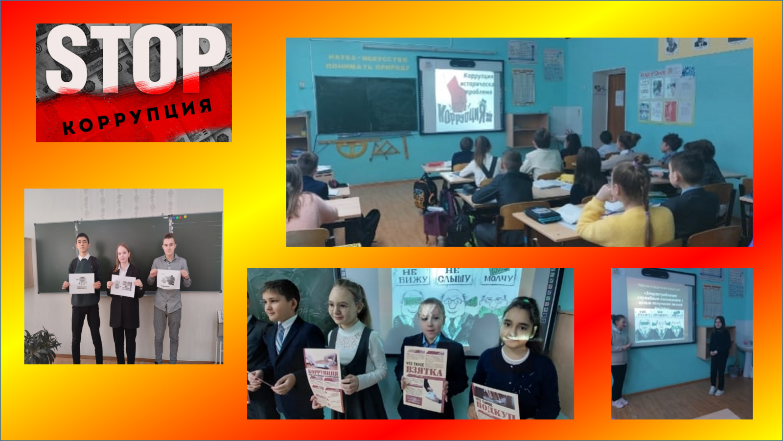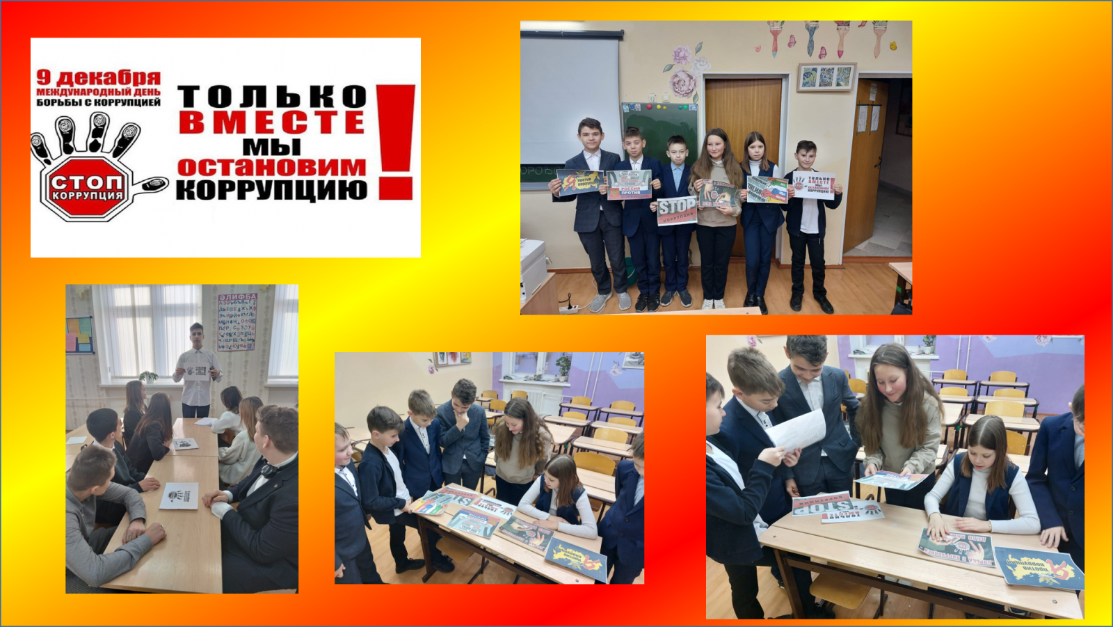 Международный день борьбы с коррупцией отмечается ежегодно 9 декабря, начиная с 2004 года. Коррупция - злоупотребление служебным положением, дача взятки, получение взятки, злоупотребление полномочиями, коммерческий подкуп либо иное незаконное использование физическим лицом своего должностного положения вопреки законным интересам общества и государства в целях получения выгоды в виде денег, ценностей, иного имущества или услуг имущественного характера, иных имущественных прав для себя или для третьих лиц либо незаконное предоставление такой выгоды указанному лицу другими физическими лицами (ст.1 Федерального Закона от 25.12.2008 № 273 – ФЗ (ред. от 24.04.2020) «О противодействии коррупции».Для учеников прошли профилактические классные часы. В 5 классе прошел классный час «Коррупция в России - преступление или образ жизни?» В 6 классе классный час в виде : «Вместе против коррупции». В 9 классе классный час «Роль СМИ в борьбе с коррупцией». Конкурс рисунков «Что такое коррупция глазами детей». Казанском Кремле состоялась церемония награждения, участвовавших в республиканском творческом конкурсе на антикоррупционную тематику. Наша школа заняла Гран- при и 3 место в номинации плакат.