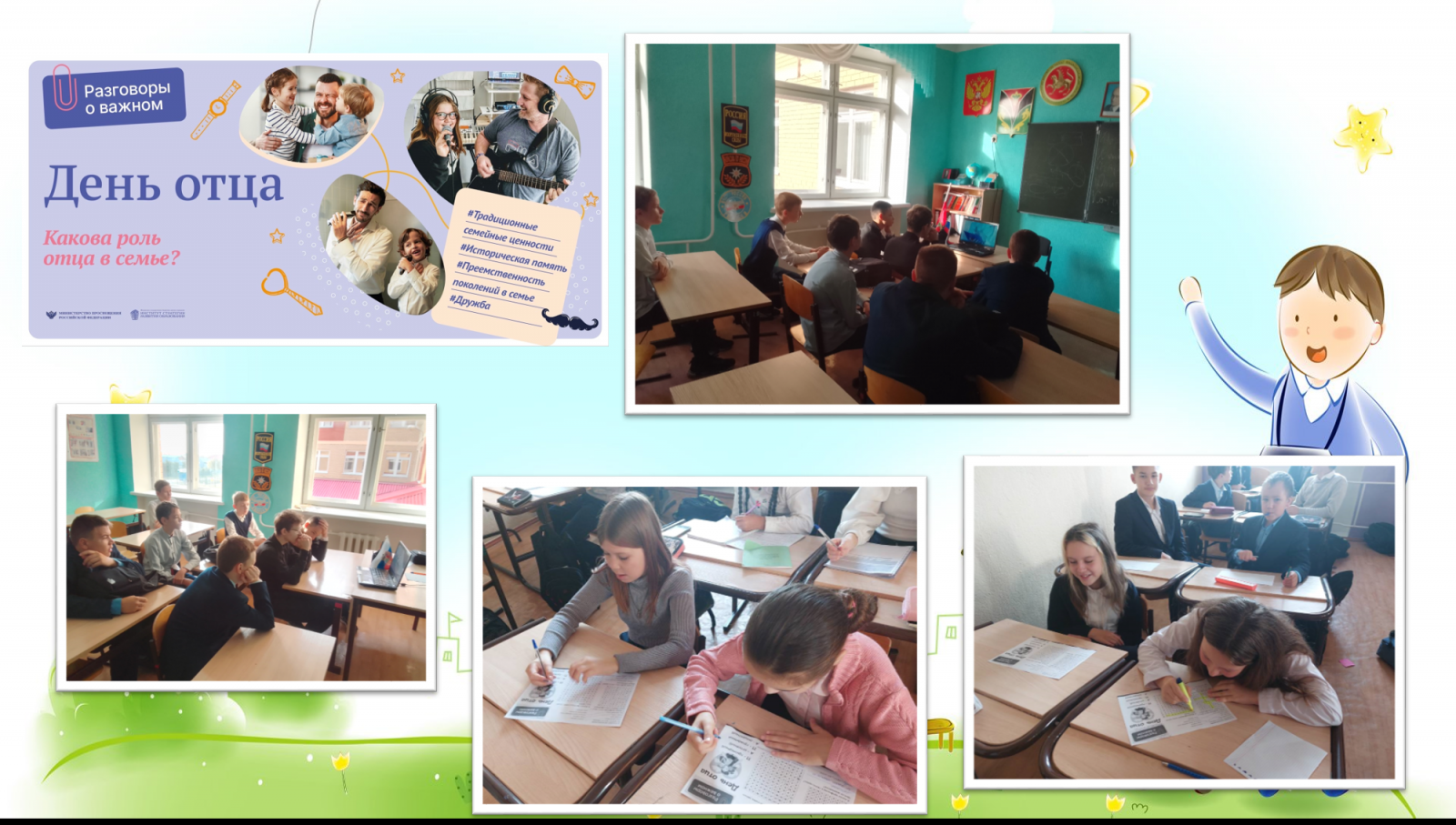 В 2022 году этот день выпадает на 16 октября. Поэтому сегодня, 10 октября, тема занятия внеурочной деятельности «Разговоры о важном» была посвящена этому предстоящему празднику. Цель занятия: воспитывать у подрастающего поколения уважение и благодарность к отцу, прививать уважение к семейным традициям и ценностям.