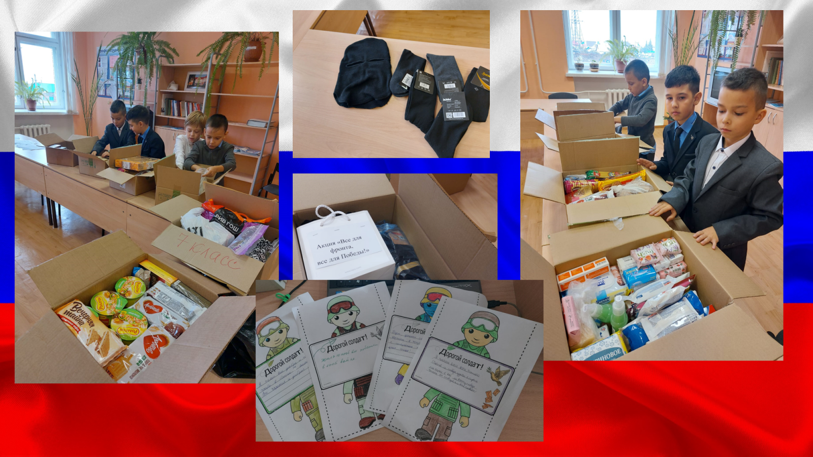 Патриотические акции «Все для фронта , все для победы!» Учащимися школы, родителями, педагогами была собрана гуманитарная помощь для солдат. Продукты питания, носки, перчатки, средства личной гигиены. Ребята начальных классов написали письма и сделали яркие рисунки.