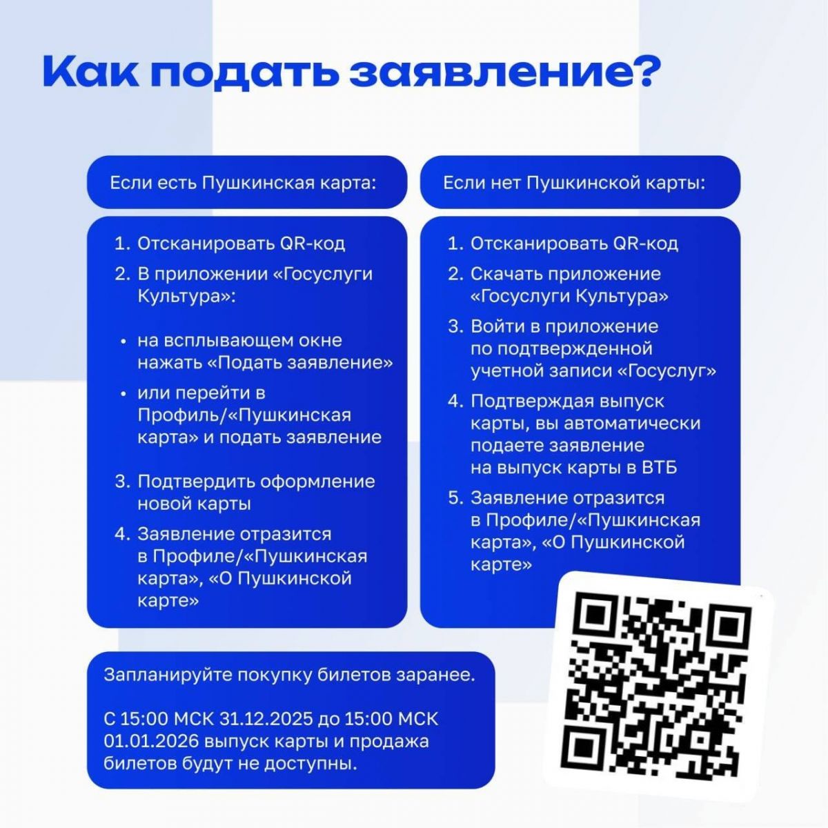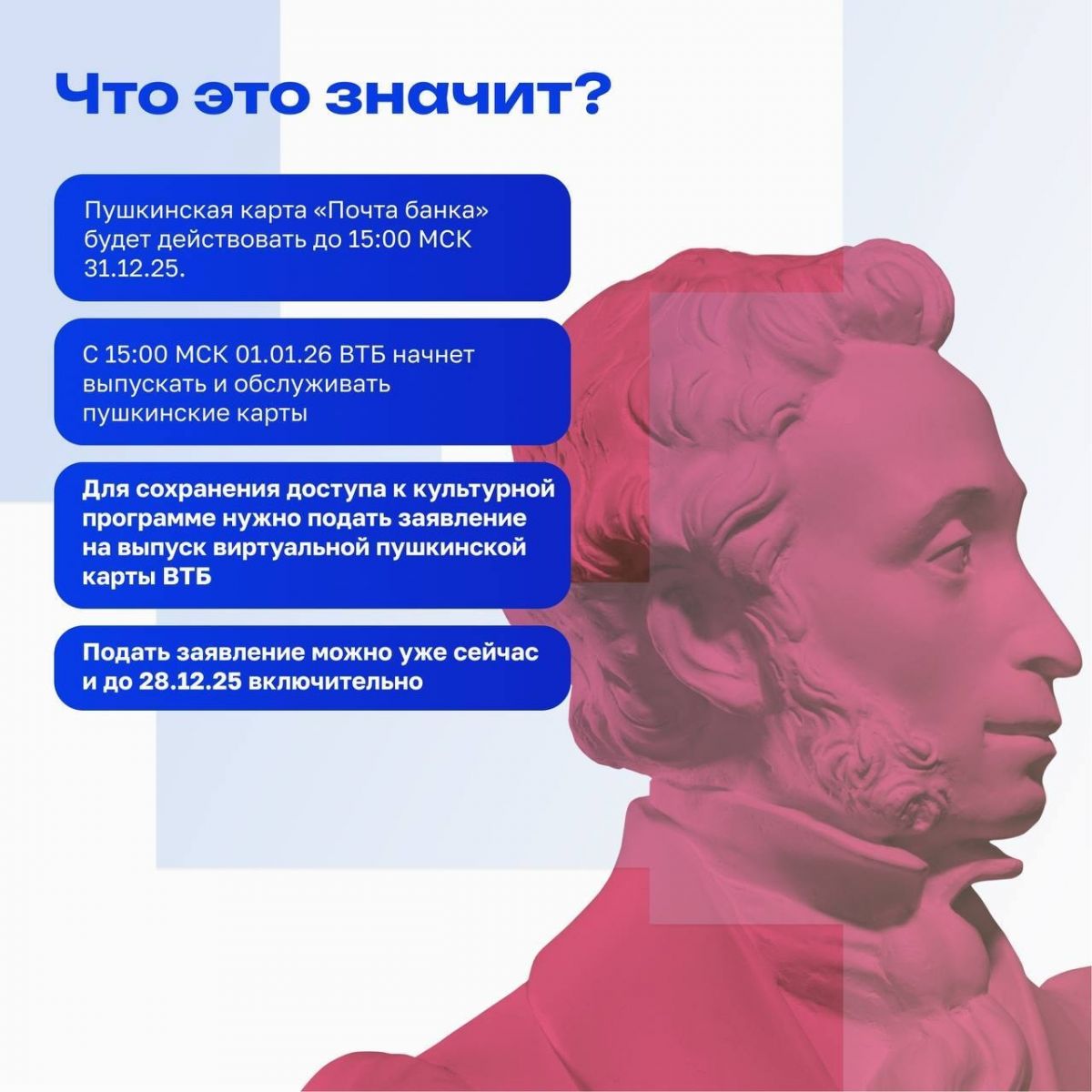 С 1 января 2026 года банком-оператором программы «Пушкинская карта» станет ВТБ. Чтобы и дальше посещать культурные мероприятия нужно подать заявление на перевыпуск карты.