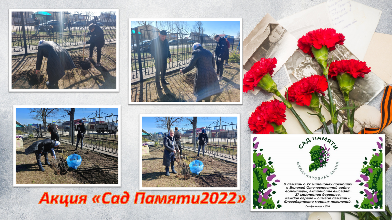 Приближается великий праздник — День Победы. дата — 77 лет! Праздник особенный для нашей страны, для всего человечества. Это «радость со слезами на глазах» — так поется в песне. И действительно, в этот день и радость, и скорбь соседствуют рядом. Международной акции "Сад памяти". Эта акция, приуроченная к 77-летию Великой Победы, проходит на всей территории России. Ее организаторы – Всероссийское общественное движение "Волонтеры Победы" и Фонд памяти полководцев Победы. Идея акции − не просто сплотить людей, а оставить вечный памятник – 27 миллионов деревьев в память о каждом из 27 миллионов погибших в Великой Отечественной войне". Учащиеся школы и сотрудники приняли активное участие.