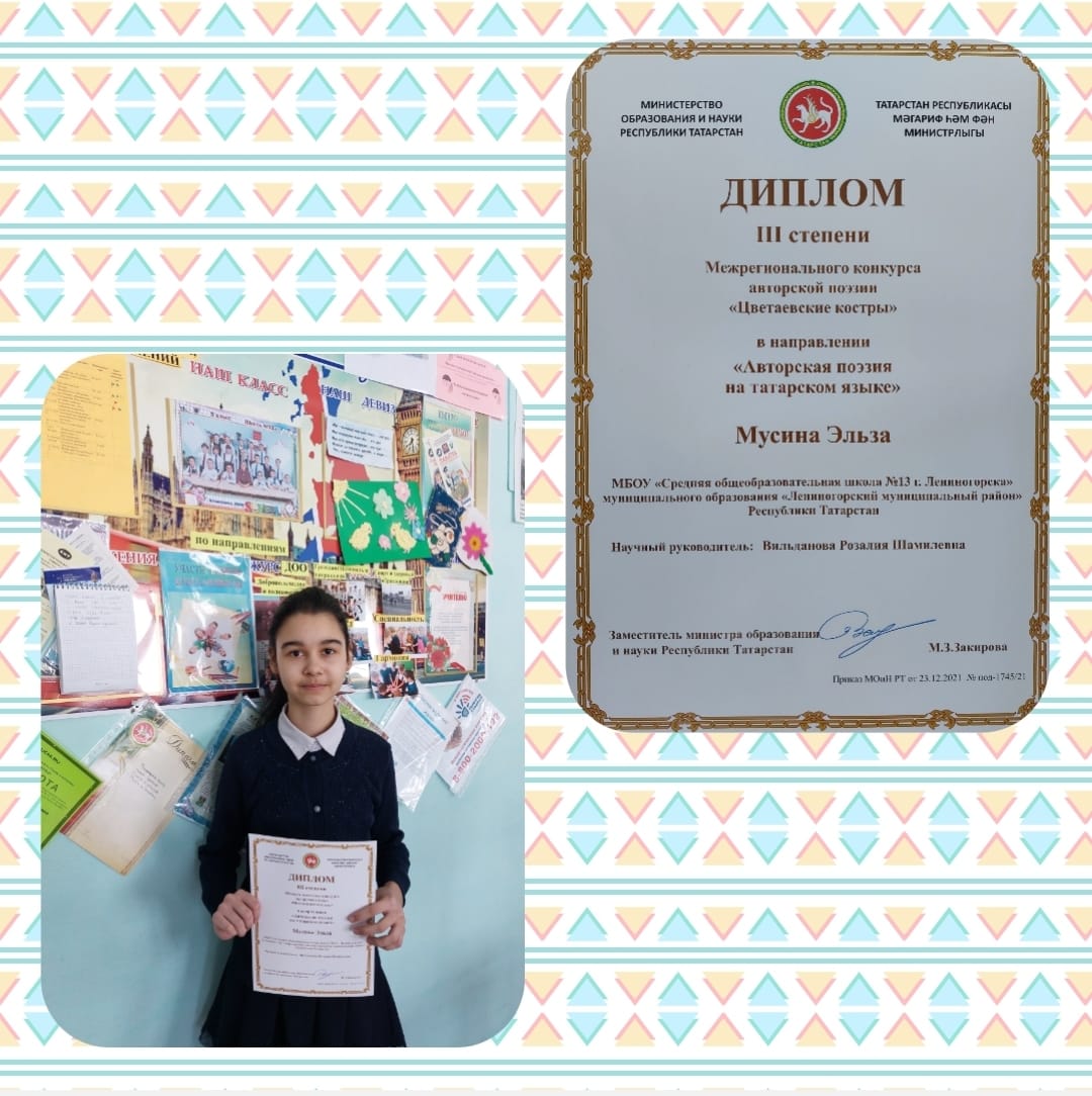 Поздравляем Мусина Эльзу, которая заняла 3 место в Межрегиональном конкурсе авторской поэзии "Цветаевские костры" в направлении "Авторская поэзия на татарском языке". Руководитель: Вильданова Р.Ш.