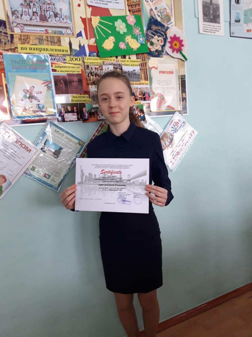 Ученица 6 класса, Лукьянова Рината, приняла участие в конкурсе исследовательских работ по страноведению "Такая разная Америка".