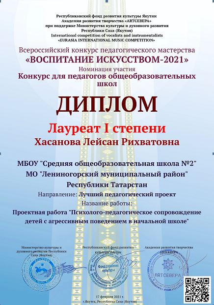 Поздравляем педагога-психолога Хасанову Лейсан Рихватовну занявшую 1 место в конкурсе для педагогов общеобразовательных школ по направлению: Лучший педагогический проект «Психолого-педагогическое сопровождение детей с агрессивным поведением в начальной школе».