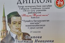 Администрация школы поздравляет учителя родного языка и литературы Осипову Людмилу Ивановну с победой в муниципальном конкурсе “Моңлы Тукай теле”, посвященном 136-летию великого татарского поэта Габдуллы Тукая. Победителей конкурса награждали на митинге у памятника Тукая 26 апреля.