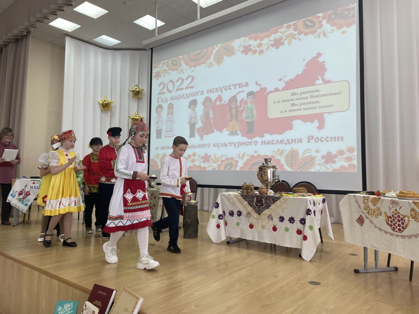 Опубликовано: 12.04.202212 апреля в нашей школе в рамках Недели детской и юношеской книги для учащихся 3-х классов прошёл фольклорный фестиваль «Культурное наследие народов России». Учащиеся 3А класса представили культуру чувашского народа, учащиеся 3Б – татарского, а ребятами 3В и 3Г классов были представлены традиции и обычаи русского народа.