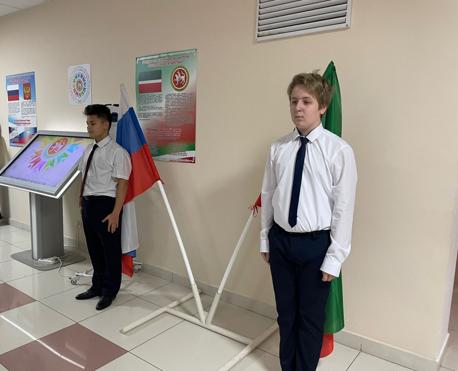 Опубликовано: 18.10.202217 октября, по традиции, в школе состоялся торжественный вынос флагов РФ и РТ и исполнение гимнов РФ и РТ. Почётное право вынести флаги РФ и РТ предоставилось учащимся 8б класса Хуснутдинову Амирхану, отличнику учёбы, призеру республиканской олимпиады школьников по математике, призеру республиканской олимпиады по геологии и географии и Хусаинову Марату, отличнику учёбы, участнику всех общешкольных дел.