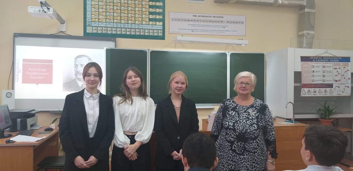 Опубликовано: 15.12.2022Сегодня, 15.12.в 9 а классе провели внекласное мероприятие. Учащиеся узнали много интересного о жизни и деятельности учёного химика и композитора А. П. Бородина. Учащиеся Колесникова Е., Моисеева А., Владимирова Т. Провели викторину и показали занимательные опыты.