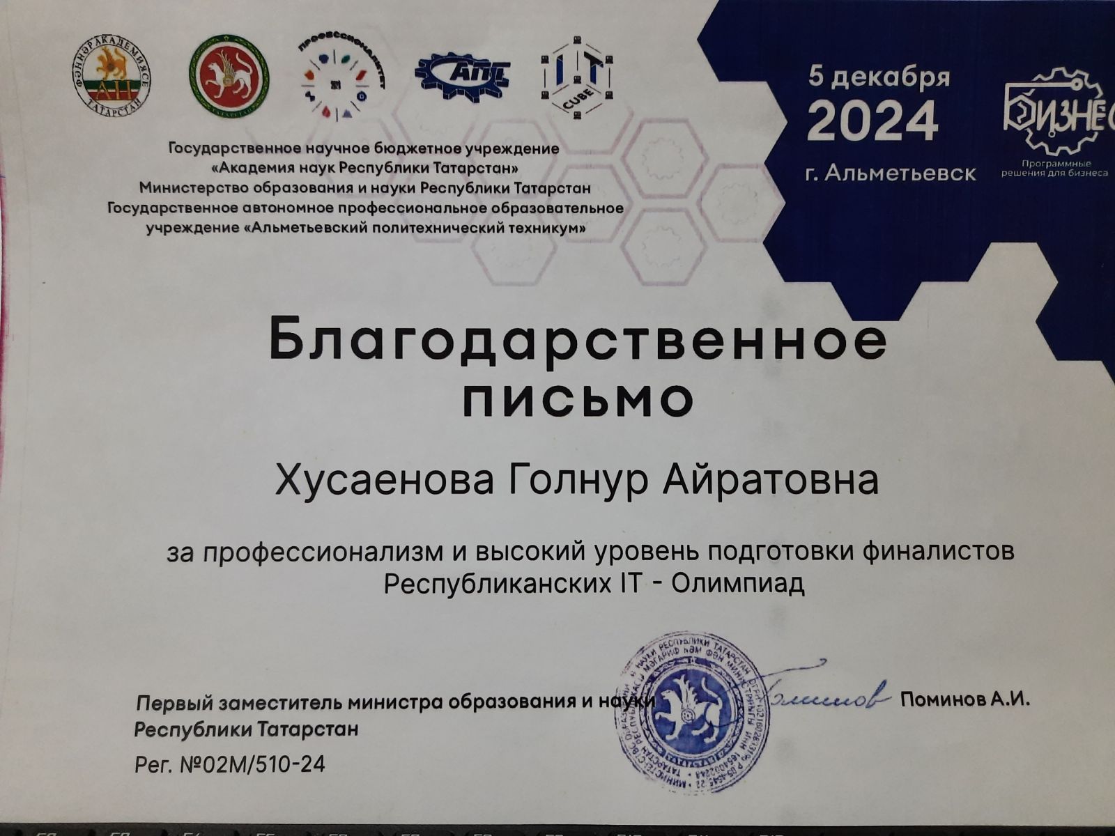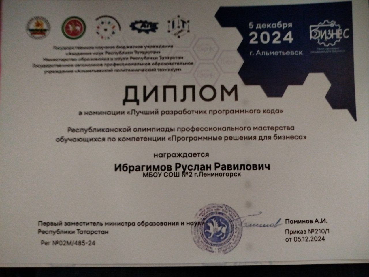 Опубликовано: 06.12.20245 декабря в городе Альметьевск прошла олимпиада профессионального мастерства среди обучающихся и студентов по IT-направлениям. В мероприятии приняли участие наши учащиеся 10 б класса Медведев А. и Ибрагимов Р., которые продемонстрировали высокий уровень знаний и навыков в области информационных технологий. Олимпиада проводилась с целью выявления талантливых студентов и повышения качества подготовки специалистов в сфере IT. Участники соревновались в выполнении практических заданий, решении теоретических задач и демонстрации своих профессиональных навыков. По итогам олимпиады Ибрагимов Р. стал лауретом в номинации "Лучший разработчик программного кода". Ребята получили ценные призы и дипломы, а также возможность продолжить своё обучение и развитие в выбранной сфере. Благодарственным письмом награждена Хусаенова Г.А. за подготовку финалистов.
