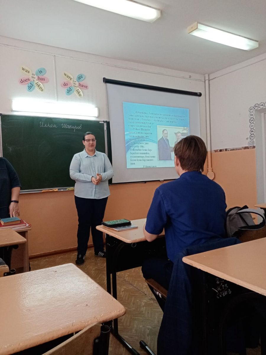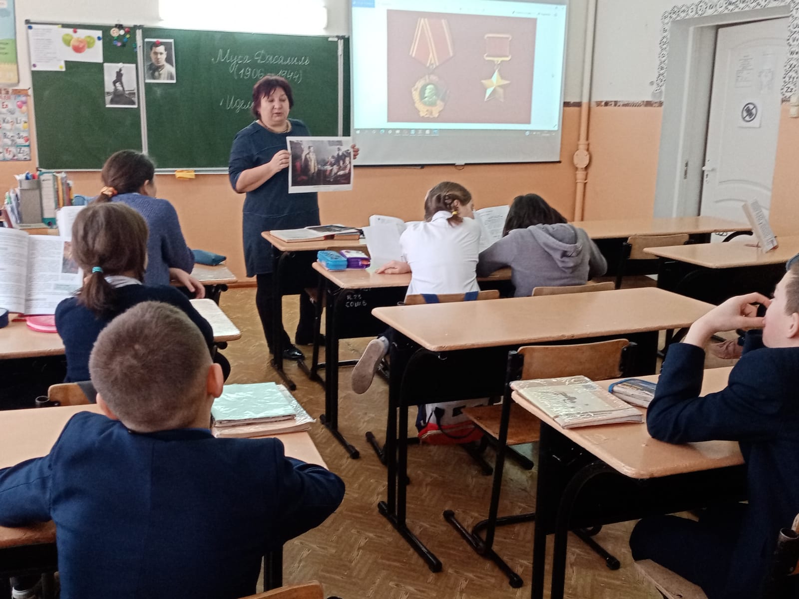В день рождения великого татарского поэта в 6 и 8 классах (учитель Журавлева М.П.) прошел урок литературы по теме “Муса Джалиль – поэт-герой”. Ребята ознакомились с жизнью известного татарского поэта Мусы Джалиля, узнали о его детстве, школьных годах и боевой комсомольской юности, прочитали и послушали стихи, которые он написал, находясь в застенках фашистского концлагеря. Кадры военной кинохроники с документального фильма дополняли устную информацию учителя и учащихся.Джалиль писал, что надо "жить, так, чтобы и после смерти не умирать". Жить не ради жизненного соблазна, славы или богатства, а ради правды и свободы, ради справедливости. И даже если наступает буря, если тьма окружила все вокруг, надо не падать духом и бороться. Джалиль, говоря об этом, своей жизнью и смертью еще раз подчеркнул свой призыв: "Свети потомкам нашим, как маяк, свети, как человек, а не светляк". -