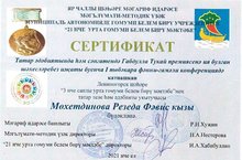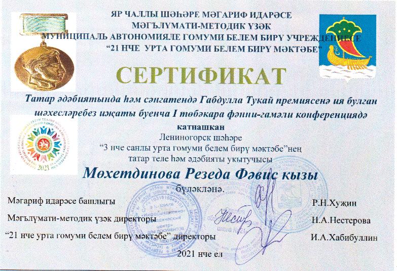 Татар теле һәм әдәбияты укытучысы Мөхетдинова Р.Ф. татар әдәбиятында һәм сәнгатендә Габдулла Тукай премиясенә ия булган шәхесләребез иҗаты буенча I төбәкара фәнни-гамәли конференциядә катнашты.Учитель родного (татарского) языка и литературы Мухутдинова Р.Ф. принимала участие в межрегиональной научно - практической конференции по творчеству лауреатов премии Габдуллы Тукая в татарской литературе и искусстве.