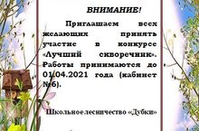 Приглашаем всех желающих принять участие в конкурсе "Лучший скворечник". Работы приносить 1 апреля в кабинет №6. Школьное лесничество "Дубки". -