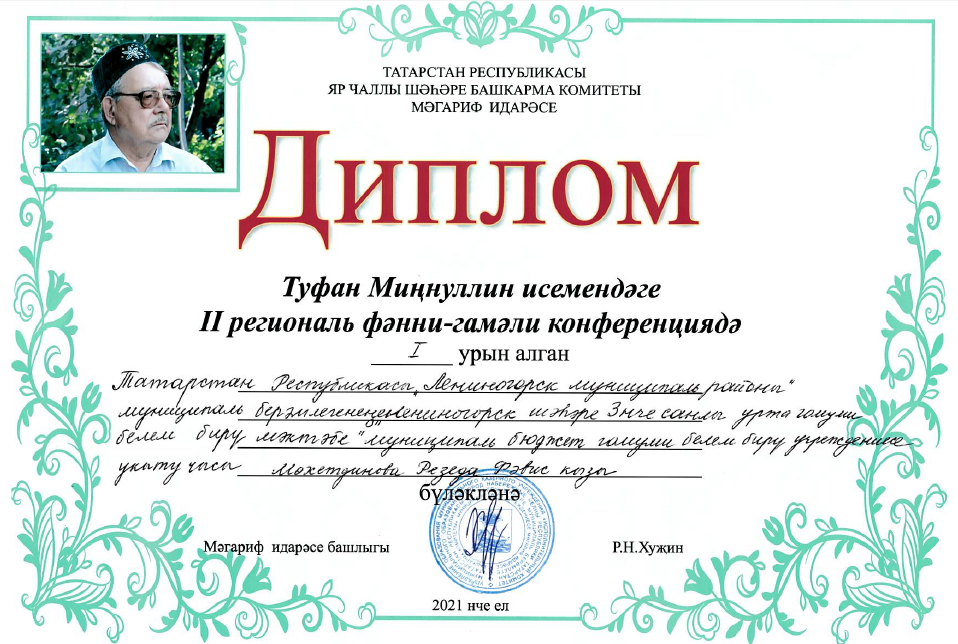 Туфан Габдулла улы Миңнуллинның иҗади мирасын киңрәк өйрәнү һәм популярлаштыру максатыннан укучылар, укытучылар, китапханәчеләр өчен Яр Чаллы шәһәренең 29ынчы гимназиясе базасында төбәкара фәнни –гамәли конференция узды. Укытучылар өчен уздырылган юнәлештә татар теле һәм әдәбияты укытучысы Мөхетдинова Р.Ф. беренче урынга, укучылар эшләре юнәлешендә 9нчы сыйныф укучысы Шәйхетдинова А. икенче урынга лаек булды.С целью более широкого изучения и популяризации творческого наследия Туфана Габдулловича Миннуллина, на базе гимназии № 29 г. Набережные Челны для учащихся, учителей, библиотекарей прошла межрегиональная научно –практическая конференция. В работе секции для педагогов - учитель татарского языка и литературы Мухутдинова Р. Ф. заняла первое место, в работе секции учащихся - ученица 9 класса Шайхутдинова А. заняла второе место. -