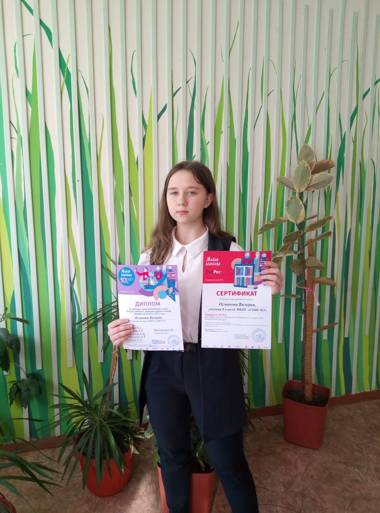 Османова В. ученица 8 класса, победила в муниципальном этапе Всероссийского конкурса чтецов "Живая классика". Поздравляем!!! -