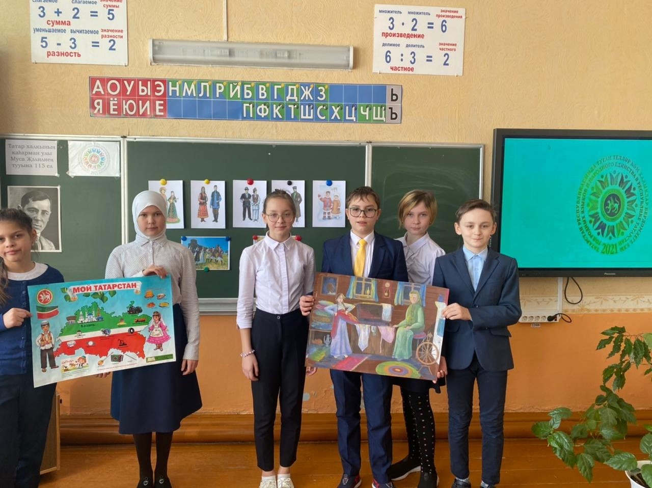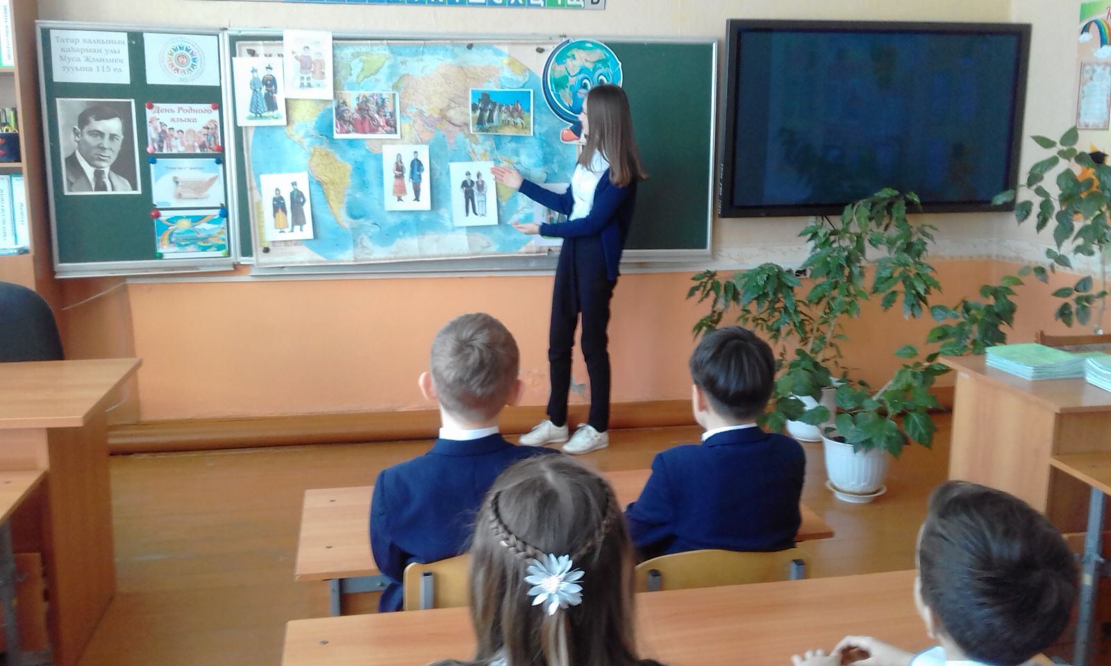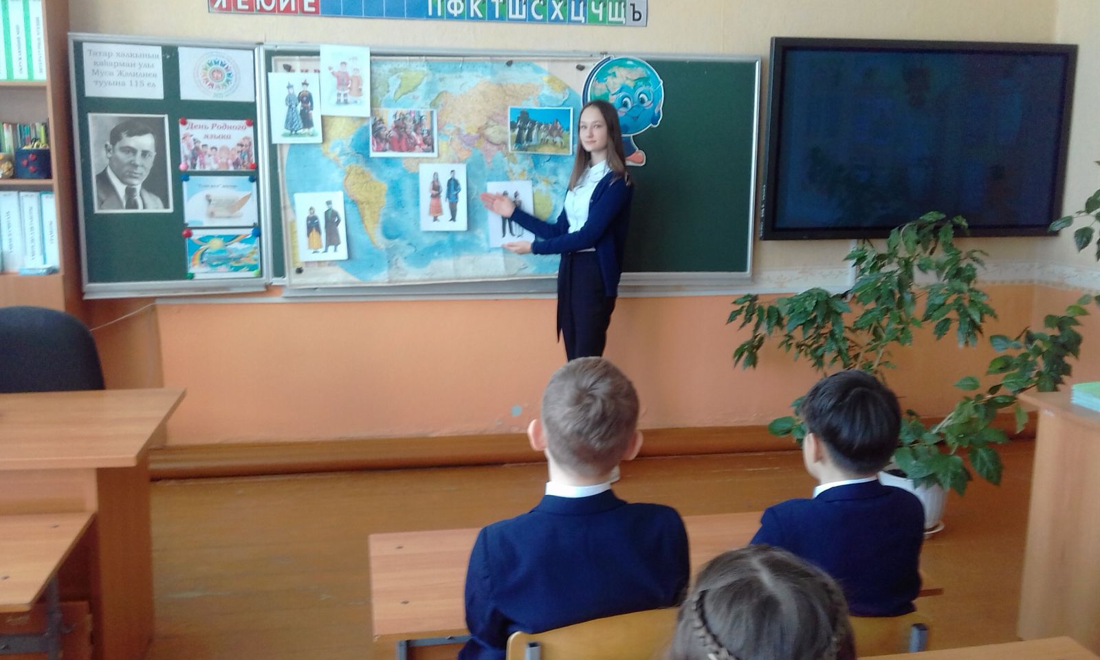Әгәр тирә-юньне карасаң, кеше кулы белән ясалган бик күп гаҗәеп әйберләрне күрергә була: самолетлар, компьютерлар, телефон. Әмма кешелек тудырган иң гаҗәеп һәм зирәк нәрсә-ул тел. Укучыларны Халыкара туган тел көне белән таныштыру, кеше тормышында һәм җәмгыять тормышында телнең ролен күрсәтү; укучыларга туган телнең бетмәс-төкәнмәс мөмкинлекләрен күрергә һәм тоярга ярдәм итү, туган телгә һәм туган халыкларның теленә мәхәббәт һәм сак караш тәрбияләү максатыннан, Халыкара туган тел көненә багышланган агитбригада чыгышы оештырылды. Укучылар дөнья телләре турында күп нәрсә белделәр, төрле телләрдә шигырьләр тыңладылар. Материал укучылар өчен бик кызыклы һәм мавыктыргыч булды.Если посмотреть вокруг, можно увидеть много удивительных вещей, созданных руками человека: самолеты, компьютеры, телефон.Но самое удивительное и мудрое, что создало человечество – это язык.С целью знакомства учащихся с праздником – Международным днём родного языка, показать роль языка в жизни человека и в жизни общества; помочь учащимся увидеть и почувствовать неисчерпаемые возможности родного языка; привития любви и бережного отношения к родному языку и к языку братских народов было организовано выступление агитбригады, посвященное ко дню международного родного языка. Учащиеся узнали многое о языках мира, послушали стихи на разных языках. Материал был очень увлекательным и интересным для учащихся. -