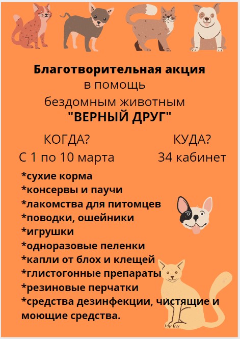 Благотворительная акция в помощь бездомным животным "Верный друг" с 1 по 10 марта, подробнее обращаться в 34 кабинет. -