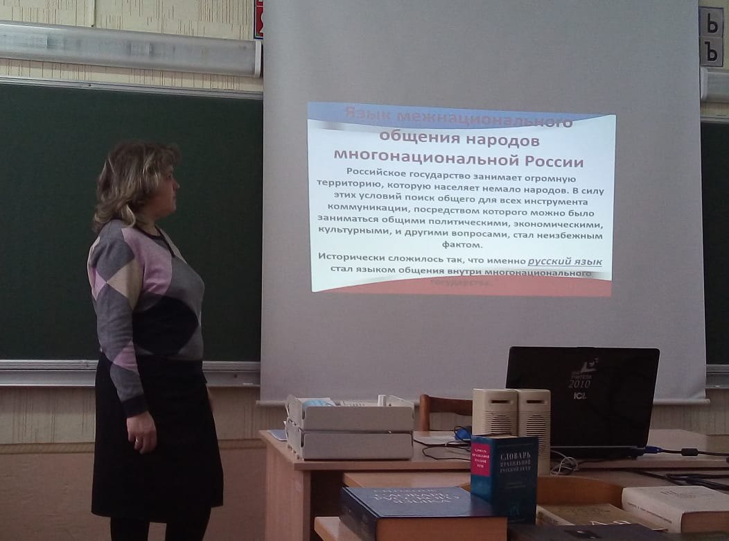 Рус теле һәм әдәбияты атналыгы башланган беренче көнне, 25 енче гыйнварда, 6- 9 сыйныфларда “ Бүгенге дөньяда рус теле” темасына дәресләр уткәрелде (ккытучы Г.Я.Маслакова). Укучылар рус теленең төп функцияләре, дөньядагы урыны турында сөйләштеләр. Моннан тыш иң сирәк очрый торган телләр белән дә таныштылар. Дәрес азагында туган телне саклау - ул халыкның мәдәниятын саклау дигән фикергә килделәр.25 января началась Неделя русского языка и литературы. В первый день Недели в 6-9 классах прошёл урок на тему "Русский язык в современном мире". В ходе урока ребята говорили об основных функциях русского языка, о его значении в современном мире. Кроме этого, они познакомились с самыми редкими и необычными языками в мире. В конце урока все ребята пришли к единому мнению, что сохранение родного языка - это сохранение культуры и самобытности народа. -