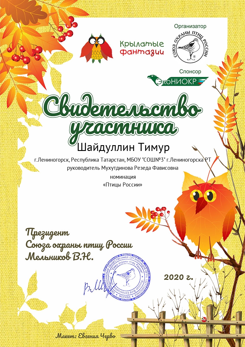 Союз охраны птиц России организовал VII интернет-конкурс поделок из природных материалов «Крылатые фантазии». Учащиеся 2 класса Шайдуллин Т. и Суслова М. приняли участие в номинации конкурса «Птицы России».