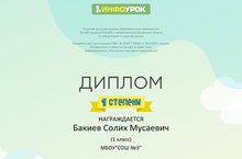 Учащиеся 1 класса Шайдуллин Тимур и Бакиев Солих (классный руководитель Мухутдинова Р. Ф.) приняли участие в международном конкурсе "Инфоурок об экологии" и заняли призовые места. Поздравляем!