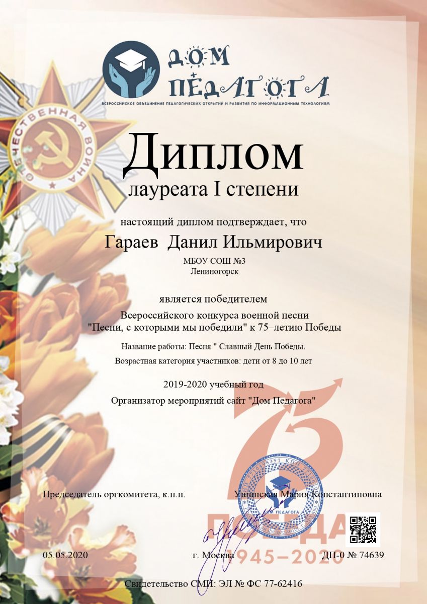 Ученик 2 класса Гараев Д. стал ЛАУРЕАТОМ I СТЕПЕНИ во Всероссийском конкурсе военной песни "Песни, с которыми мы победили" к 75–летию Победы (руководитель Ключникова Э. Ш.)Победа в Великой Отечественной войне 1941-1945 г.г. - важнейшее событие в современной мировой истории, величайший подвиг нашего народа.Нас всех объединяет общее прошлое, и мы должны быть достойными жертвенного подвига, совершенного нашими отцами, дедами и прадедами в военные годы. Мы не имеем права забывать о том, какой ценой досталась нашим предкам Великая Победа, и о том, что они завоевали ее, сражаясь плечом к плечу, для того чтобы мы и наши дети жили в мире. Сколько бы лет ни прошло, память об этой войне и о Великой Победе должна жить в сердце народном, чтобы не прерывалась связь времен. -