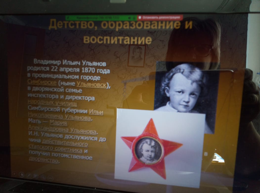 В 8 классе прошёл классный час (классный руководитель Маслакова Г. Я.) на тему "Владимир Ильич Ленин. Страницы истории", посвящённый 150-летию со дня рождения великого вождя советского пролетариата. В ходе классного часа учащиеся познакомились с основными биографическими сведениями В. И. Ленина, узнали о его роли в построении нового социалистического государства. Кроме этого, совершили виртуальную экскурсию по улицам родного города Симбирска (ныне Ульяновск). Обратили внимание, что имя Ленина увековечено в названиях улиц, парков, площадей и городов нашей страны.
