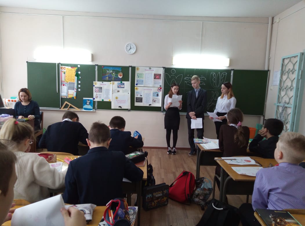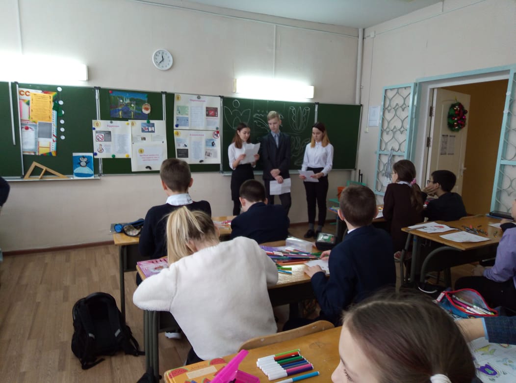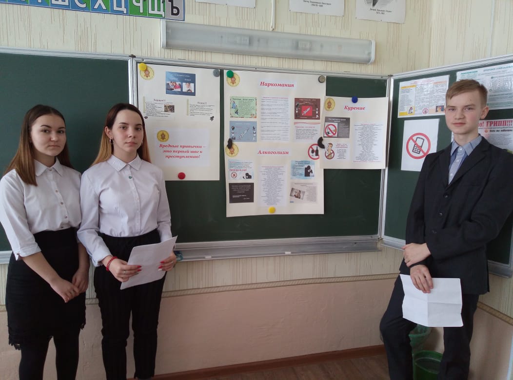 Учащиеся 8 класса, члены отряда "Форпост" (руководитель Маслакова Г. Я.), провели беседу с учениками 5, 6, 7 классов на тему "Вредные привычки - первый шаг к преступлению". -