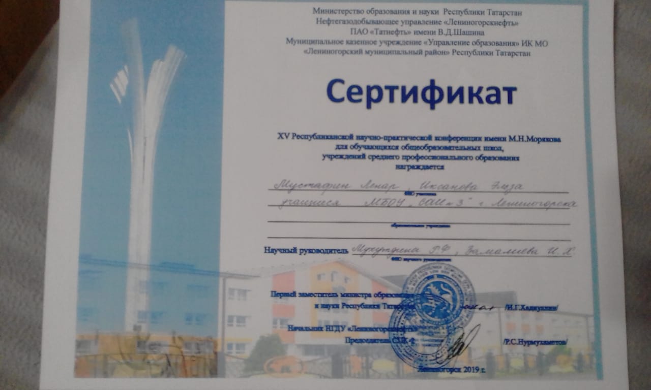 XV Республиканская научно-практическая конференция имени М. Н. Морякова для обучающихся общеобразовательных школ, учреждений среднего профессионального образования. Участвовали наш ученик 7 класса Мустафин Л. и ученица 8 класса Иксанова Э.
