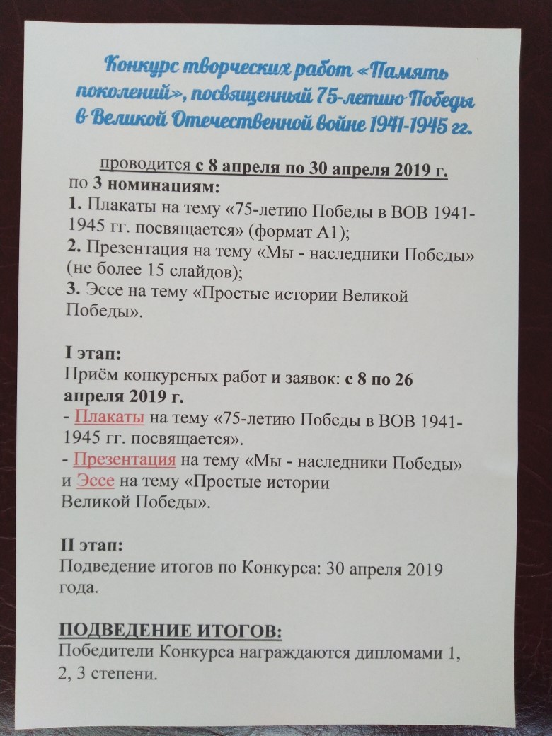 Конкурс творческих работ "Память поколений" 08.04.2019