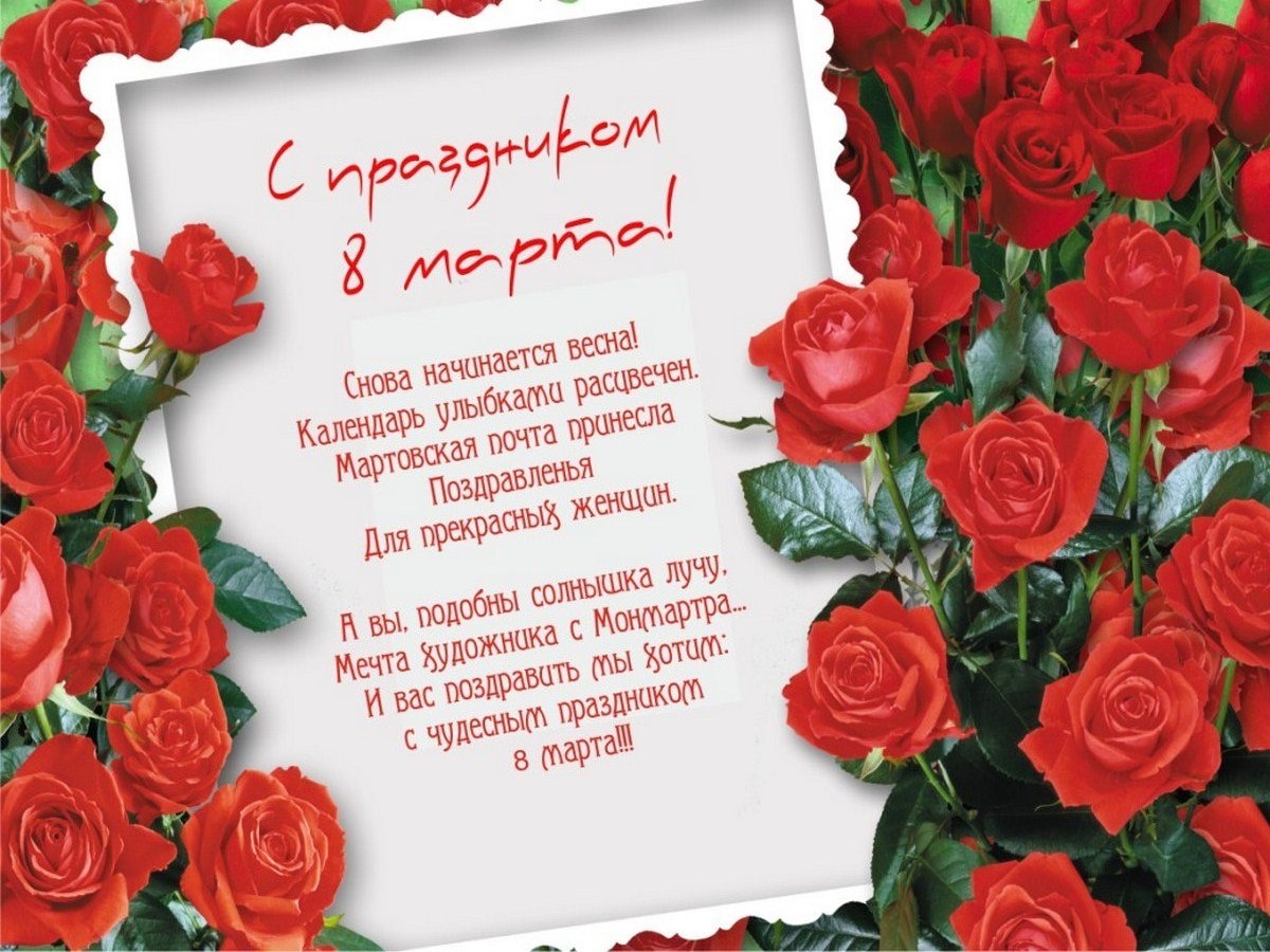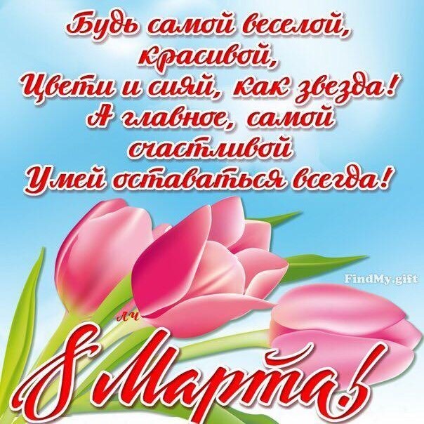 Позвольте вас поздравить с праздником весны, красоты и любви - с 8-м Марта! Пусть сегодня ваша душа до краев наполнится светом, теплом и радостью от искренних пожеланий, нежных цветов, приятных подарков! Пусть ласточки вьют гнезда над вашими окнами и несут в дом благополучие и взаимопонимание, а первые лучи весеннего солнышка укажут на счастливую тропинку вашей судьбе!