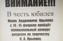 ВНИМАНИЕ!!!В честь юбилеяИвана Андреевича Крыловас 14 - 16 февраля пройдёт муниципальный конкурс рисунков по творчествуИ. А. Крыловасреди учащихся 5 и 6 классов.Лучшие работы будут отправлены на конкурс между школами города и района!!!Требования:формат рисунка А 3;на обороте рисунка подписать школу, Ф. И. О., класс;рисунки принимаю до 13 февраля включительно;рисунки сдаём библиотекарю Андреевой Л. М. -
