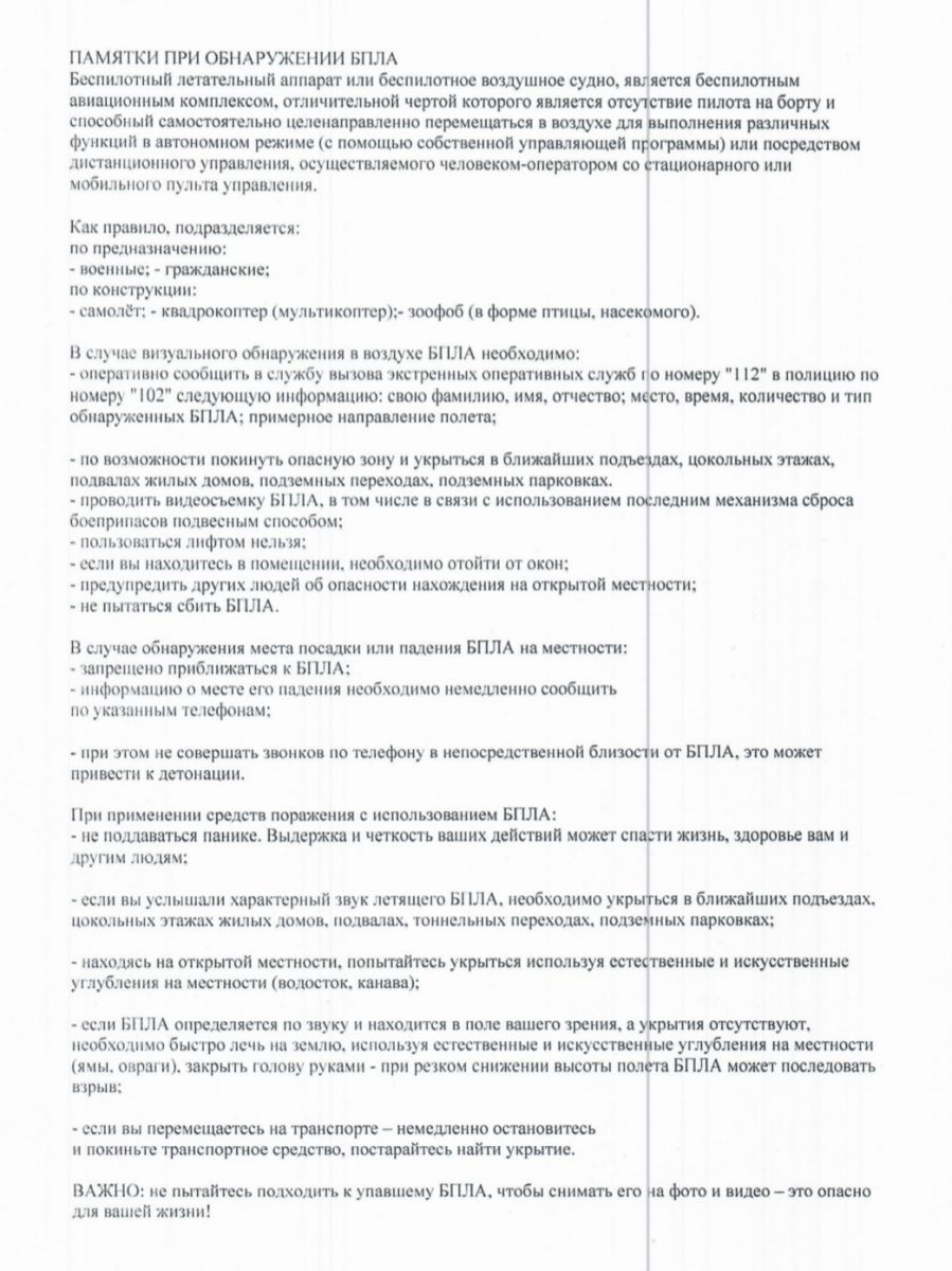 Памятки при обнаружении БПЛА