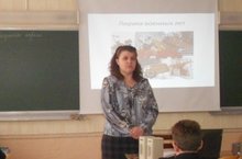 В 7 классе прошел урок литературы на тему «Лирика военных лет». Вместе с учителем Маслаковой Г.Я. учащиеся подготовили материалы о судьбе поэтов-фронтовиков: К.Симонова, А.Твардовского, Ю.Друниной, О.Берггольц и других. Ребята прочитали их стихотворения, прослушали песни, написанные в годы Великой Отечественной войны.