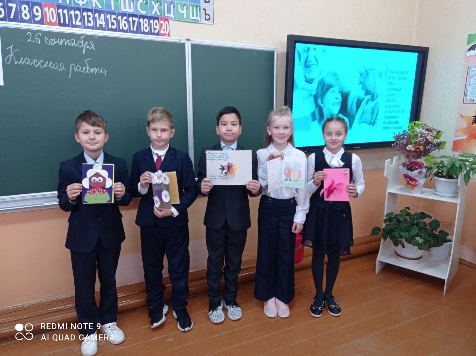 26 сентября в 4 классе прошло занятие «Разговор о важном». Занятие было посвящено ко Дню пожилых людей.Цель занятия: воспитывать у обучающихся третьих-четвертых классов осознание того, что пожилые люди – чьи-то мамы и папы, бабушки и дедушки, много сделавшие за свою жизнь для молодого поколения – нуждаются во внимании и заботе. С учащимися были проведены беседа и интерактивные задания.Известно, что лучший подарок – это подарок, сделанный своими руками. А для пожилых людей самая большая радость – получить подарок, сделанный руками любимых внуков. Было выполнено творческое задание «Открытка в подарок». -