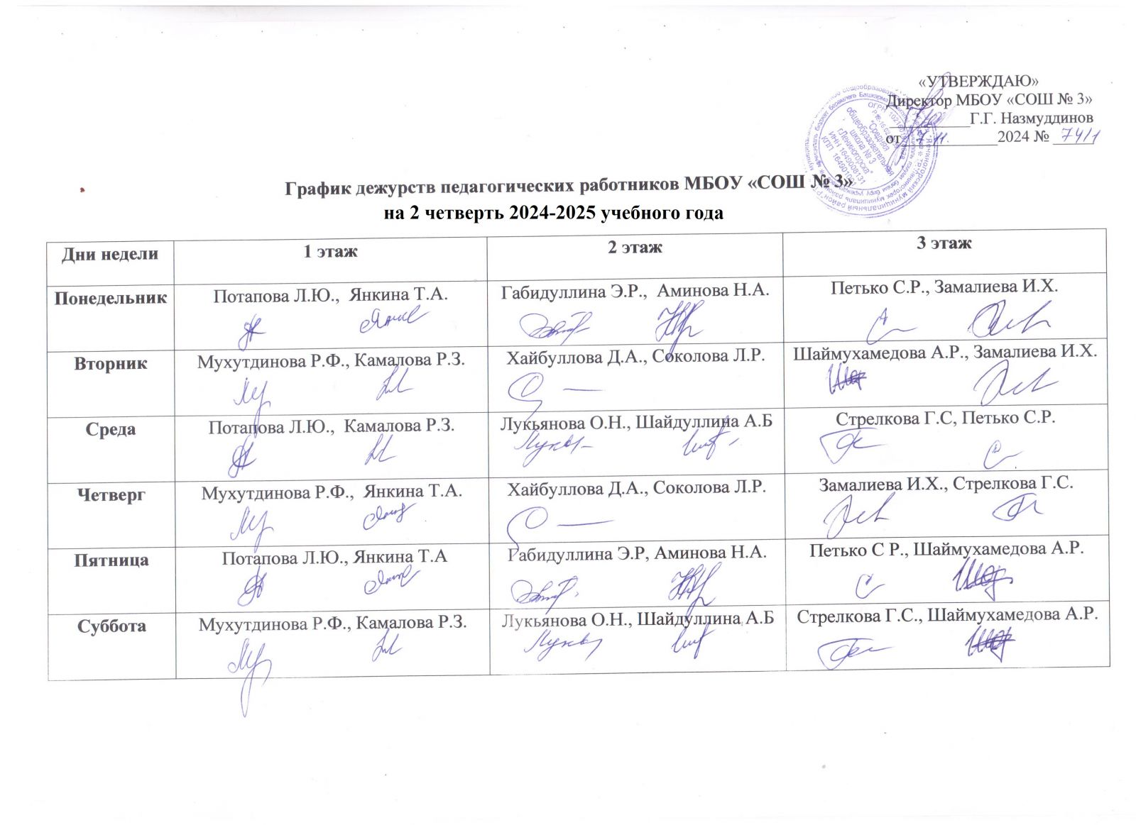 График дежурств учителей на 2 четверть 2024-2025 учебного года