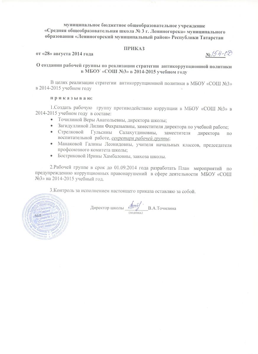О создании рабочей группы по реализации стратегии антикоррупционной политики в школе