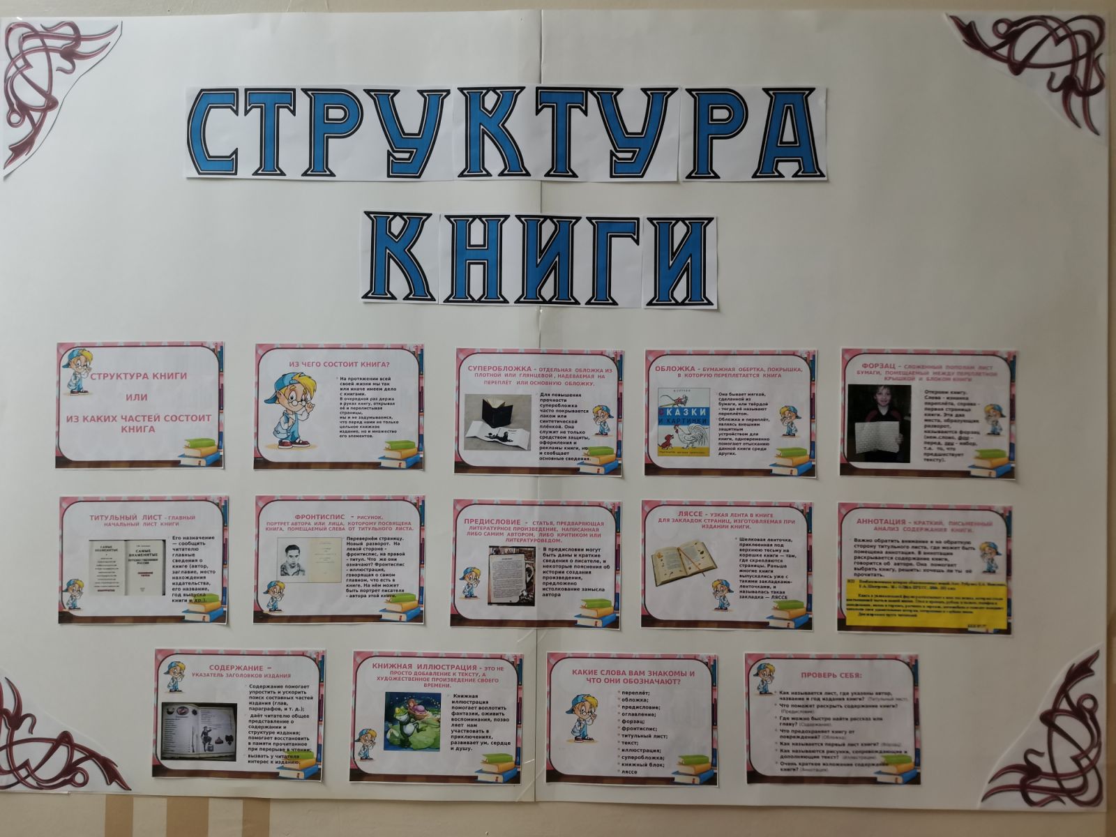Вы все часто бываете в библиотеке и знаете, как много здесь книг. Как же не ошибиться и выбрать нужную? Очень просто. Ведь книга сама может рассказать о себе. В школьной библиотеке оформлен информационный стенд "Структура книги", приуроченный международному месячнику школьных библиотек. -