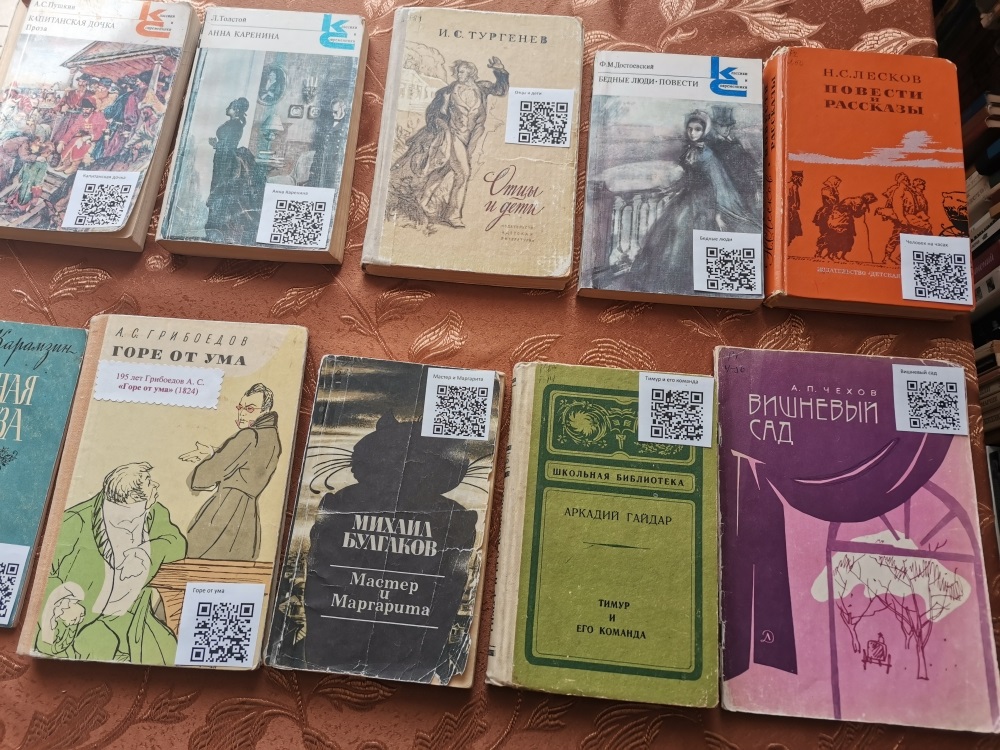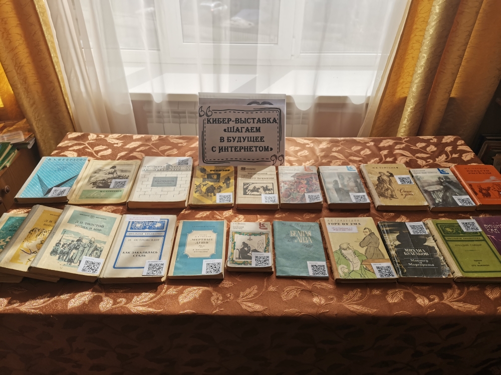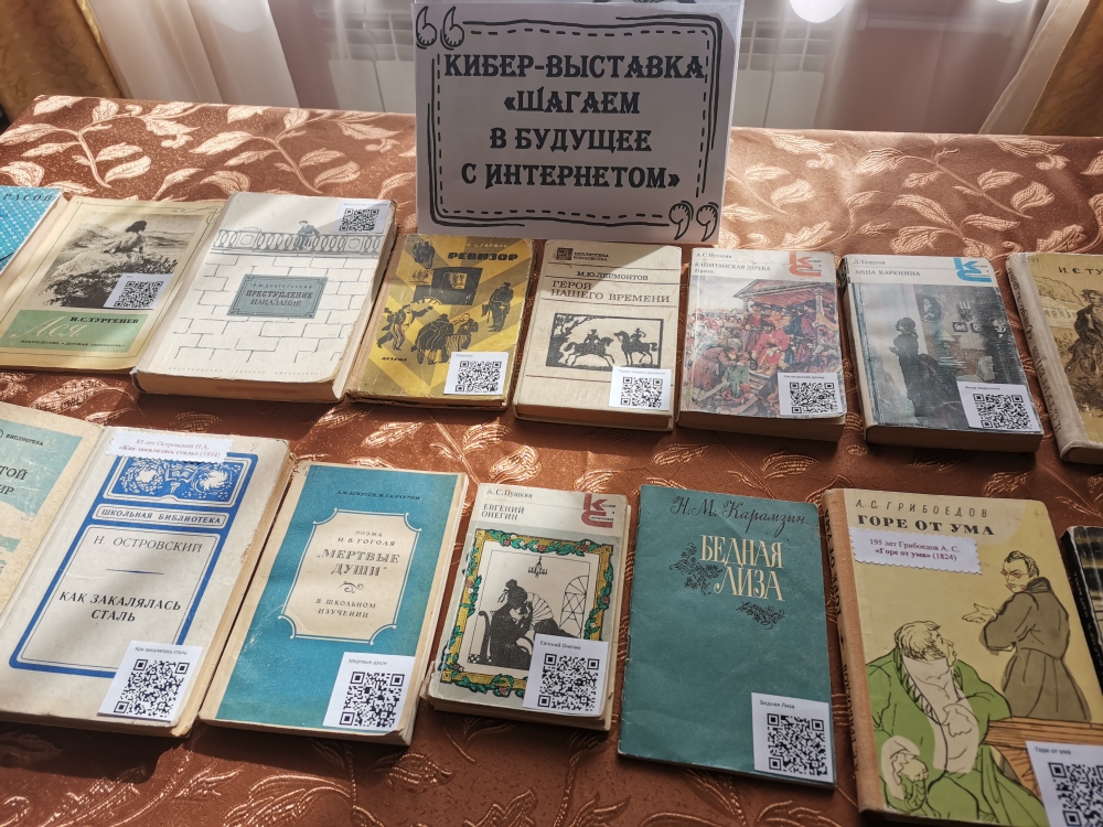 В школьной библиотеке представлена кибер-выставка "Шагаем в будущее с Интернетом", где учащиеся могут познакомится с представленными книгами, используя современное приложение считывания QR-кодов. При сканировании qr-кода с выбранной книги, можно прочитать аннотацию и выбрать понравившуюся для себя книгу для домашнего чтения.