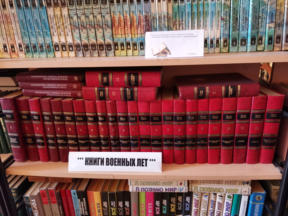 В школьной библиотеке открыта выставка – инсталляция "В сердцах и книгах память о войне".Близок великий праздник День Победы, который остается в сердцах нашего народа одним из самых трагичных и незабываемых событий военной истории нашего Отечества. Солдаты Великой Отечественной Войны … Что мы знаем о них? Они обладали той «живой силой», которая помогала жить, любить, творить… Все те, кто не потеряли присутствие духа, шли до конца, даже когда оставалось «до смерти четыре шага». Тысячи и тысячи отцов, сынов, матерей, дочерей Отчизны погибли в самом начале своей жизни…Хранителями памяти поколений выступают книги. Война против фашизма стала для многих писателей не материалом для книг, а судьбой целого народа.От героев былых времен