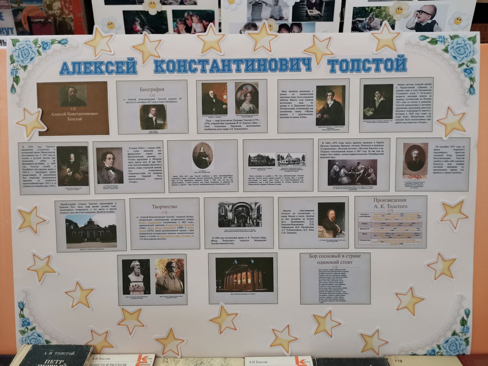 В 2022 году в России отмечается 205-летний юбилей Алексея Константиновича Толстого, русского поэта, драматурга и писателя. К этой памятной дате в школьной библиотеке оформлена книжная выставка «Творческое наследие А.К. Толстого». Книги представленные на выставке, познакомят с многогранной личностью и творчеством А.К. Толстого, погружают в атмосферу жизни краснорогской усадьбы времен Алексея Константиновича. Посетители выставки подробнее смогут ознакомиться с самыми известными произведениями писателя, также познакомиться с его жизненью и творчеством на информационном стенде. -