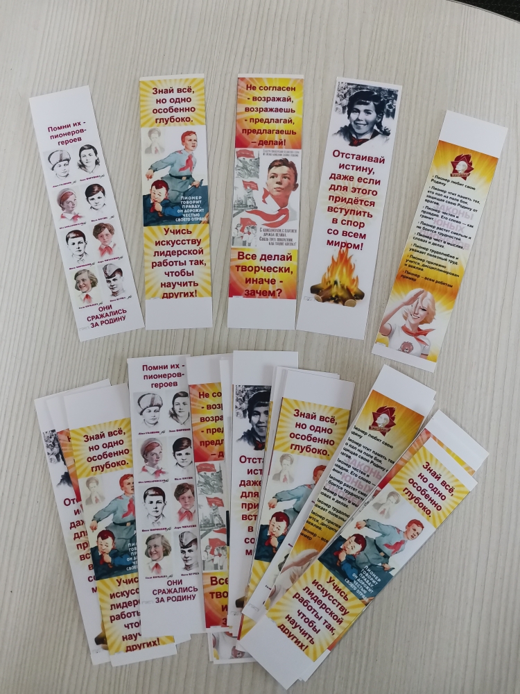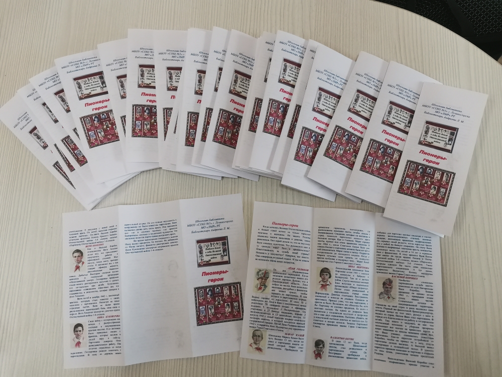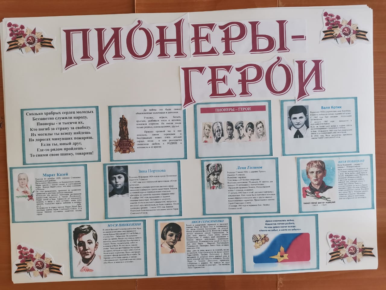 Пионеры-герои — советские пионеры, совершившие подвиги в годы становления Советской власти, Великой Отечественной войны.Образы пионеров-героев активно использовались в Советском Союзе как примеры высокой морали и нравственности. Официальный список «пионеров-героев» был оформлен в 1954 году с составлением Книги почёта Всесоюзной пионерской организации имени В.И. Ленина; к ней присоединились Книги почёта местных пионерских организаций.Четверо пионеров-героев были удостоены звания Героя Советского Союза: Лёня Голиков, Марат Казей, Валя Котик, Зина Портнова. Голикову, единственному из всех, звание было присвоено непосредственно во время войны (02.04.1944), остальным по окончании войны.Многие юные участники войны погибли в боях или были казнены немцами. Ряд детей был занесён в «Книгу почёта Всесоюзной пионерской организации им. В.И. Ленина» и возведён в ранг «пионеров-героев».В школьной библиотеке прошла выставка книг "Пионеры-герои" для учащихся 8 класса. Учащиеся ознакомились с выставкой предложенных книг, просмотрели листовки, записи времен ВОв. По окончанию экскурсии получили буклеты с информацией о пионерах-героях, изготовленными школьным библиотекарем Андреевой Л. М. -