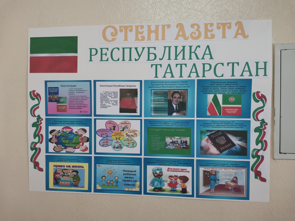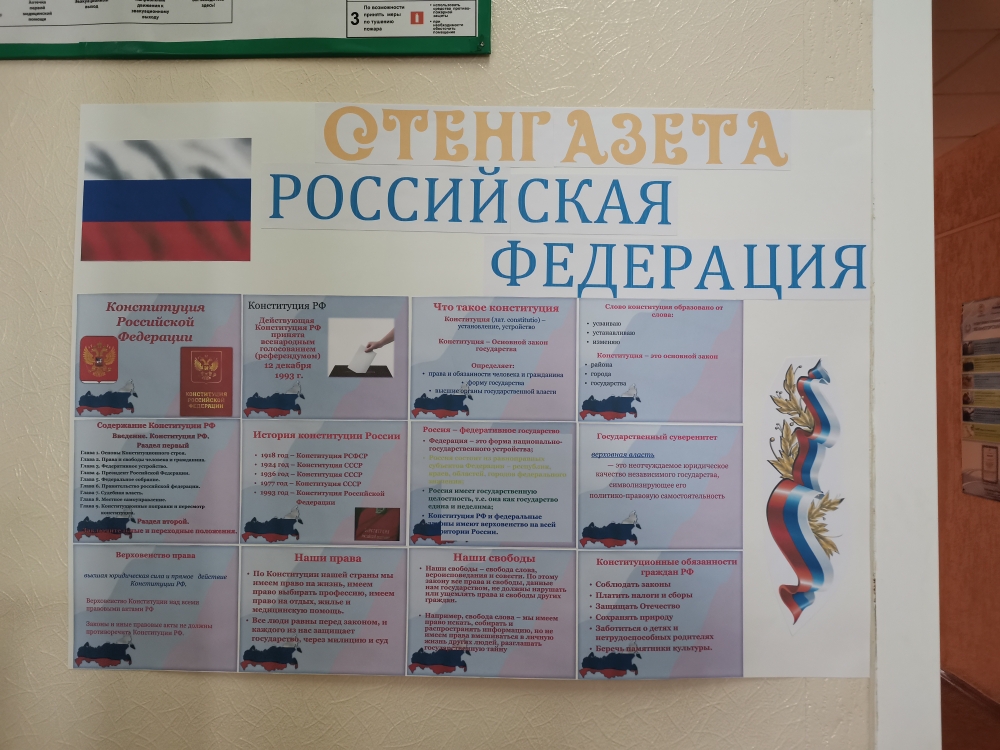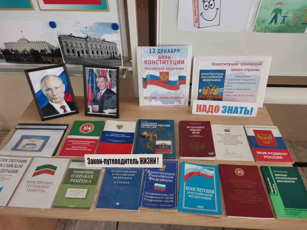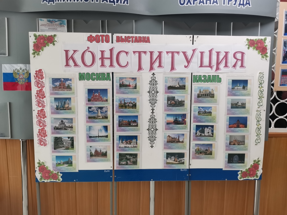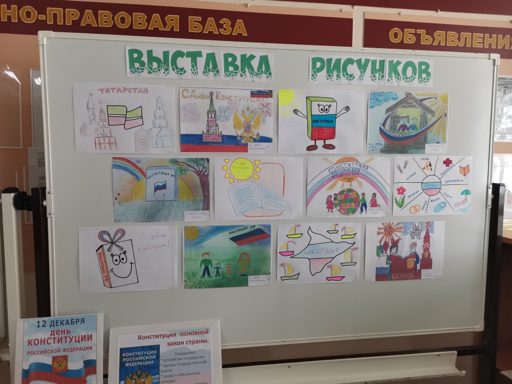 В фойе первого этажа нашей школы библиотекарь Андреева Л. М. оформила тематические выставки:- выставка детских рисунков "С Днем Конституции";- тематическая книжная выставка "Надо знать", на выставке представлены издания Конституции РФ, Конституции РТ, парламентские издания, книги о праве;- фотовыставка "Конституция", на выставке представлены фотографии достопримечательностей нашей страны и Республики;- тематические стенгазеты. -