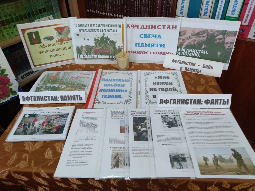 В школьной библиотеке оформлена выставка посвященная дню вывода советских войск с Афганистана. На выставке представлены статьи, фотоальбом, альбом памяти героев и многое другое. Учитель истории Мингазова Г. М. рассказала учащимся о трудностях прохождения службы, о героизме наших солдат.Самым долгожданным моментом для учащихся стало зажжение свечи памяти и минута молчания о погибших солдатах, отдавая дань уважения тем, кто проявил высочайшую силу духа, самоотверженность, героизм, выполняя боевой долг. К мероприятию была оформлена книжная выставка «Мы знаем и помним» и фотовыставка «Афганистан: боль и память». -