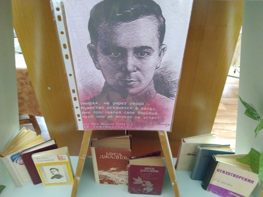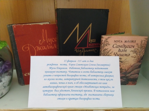 Мәктәп китапханәсендә бөек шагыйрь М.Җәлилнең тууына 115 ел тулуга багышланган «Муса Җәлил татар шагыйре - герой» дип исемләнгән китап-иллюстрация күргәзмәсе оештырылды. Күргәзмәдә М. Җәлилнең китаплары, аның биографиясе һәм тормыш фактлары тәкъдим ителгән. Әлеге күргәзмә туган телләр елына багышланган.В школьной библиотеке организована книжно - иллюстрированная выставка «Муса Джалиль татарский поэт-герой», посвященная 115-летию со дня рождения великого поэта М. Джалиля. На выставке представлены книги М. Джалиля, его биография и факты из жизни. Данная выставка посвящена Году родных языков. -