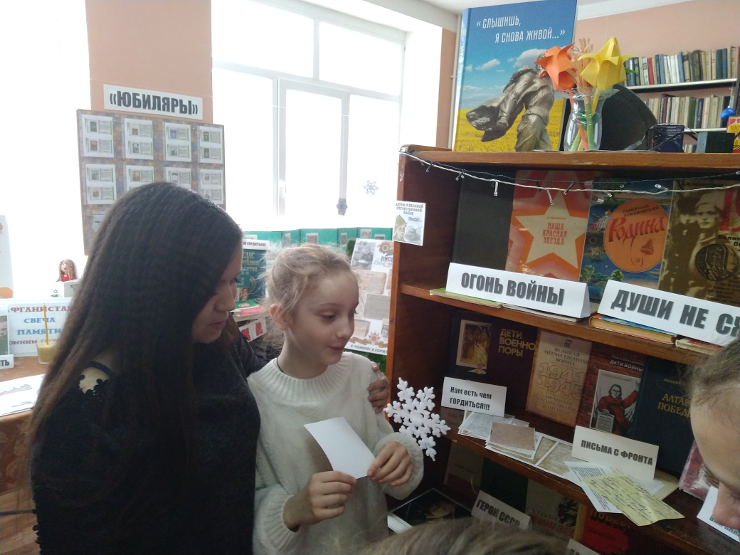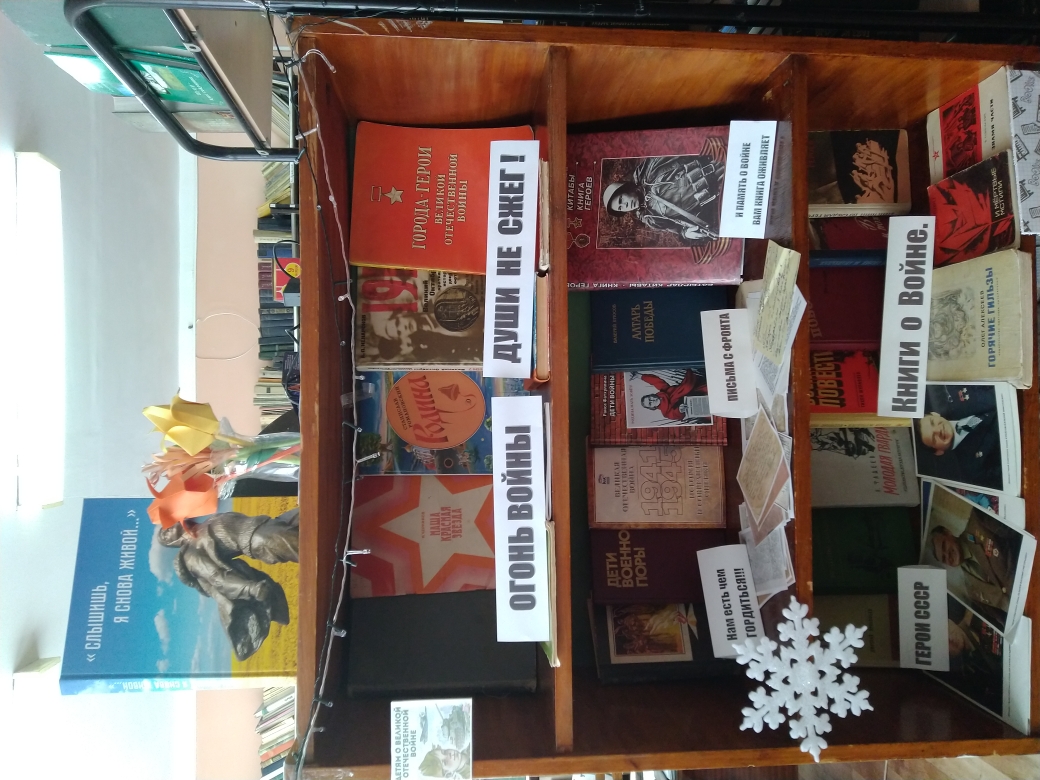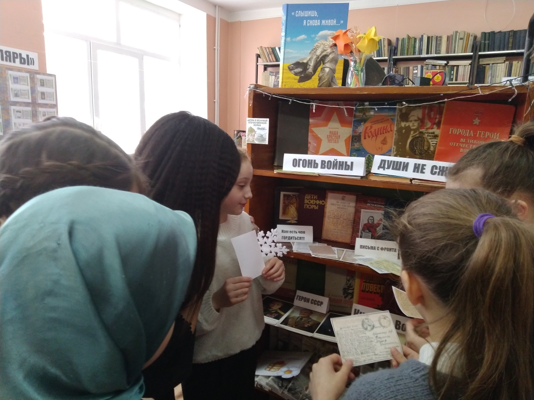 В школьной библиотеке оформлена выставка под названием “Огонь войны души не сжег”. На данной выставке представлены книги о войне, портреты героев СССР с описанием их подвигов, душераздирающие письма с фронта. Учащиеся с удовольствием посещают выставку, интересуются фактами о войне расписанных в книгах. Со слезами на глазах читают представленные на выставке письма. -