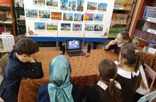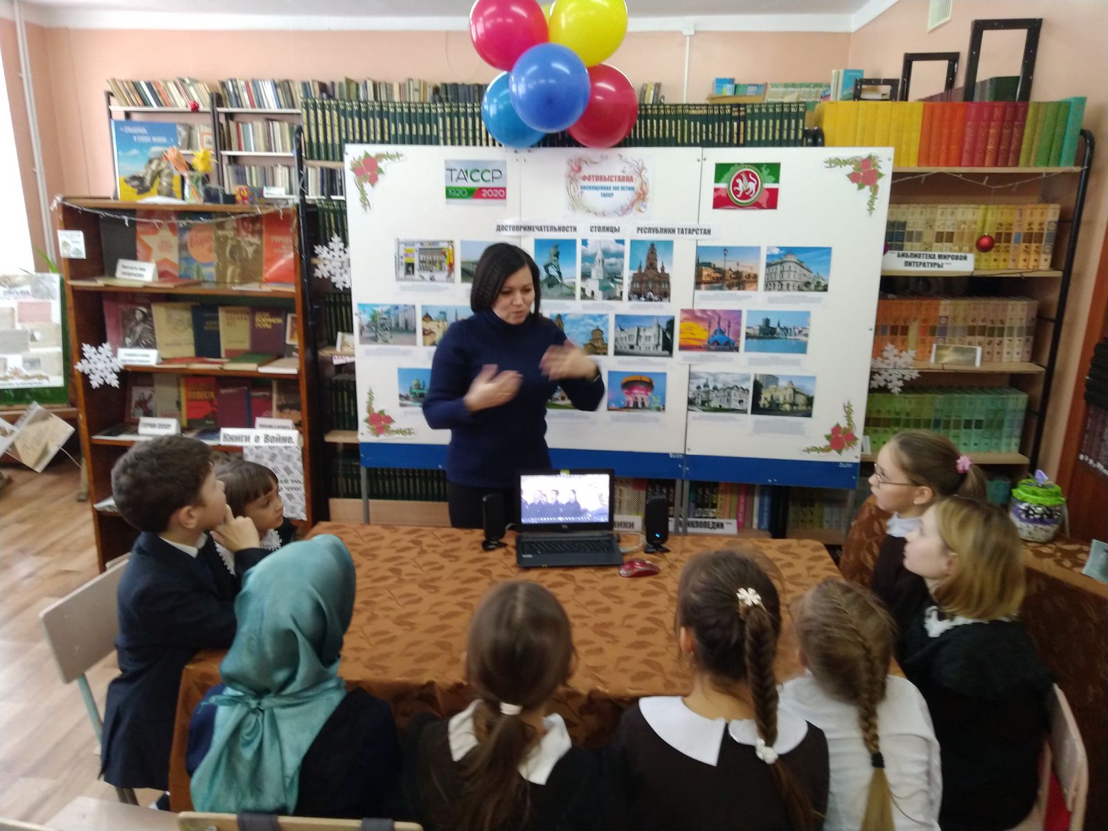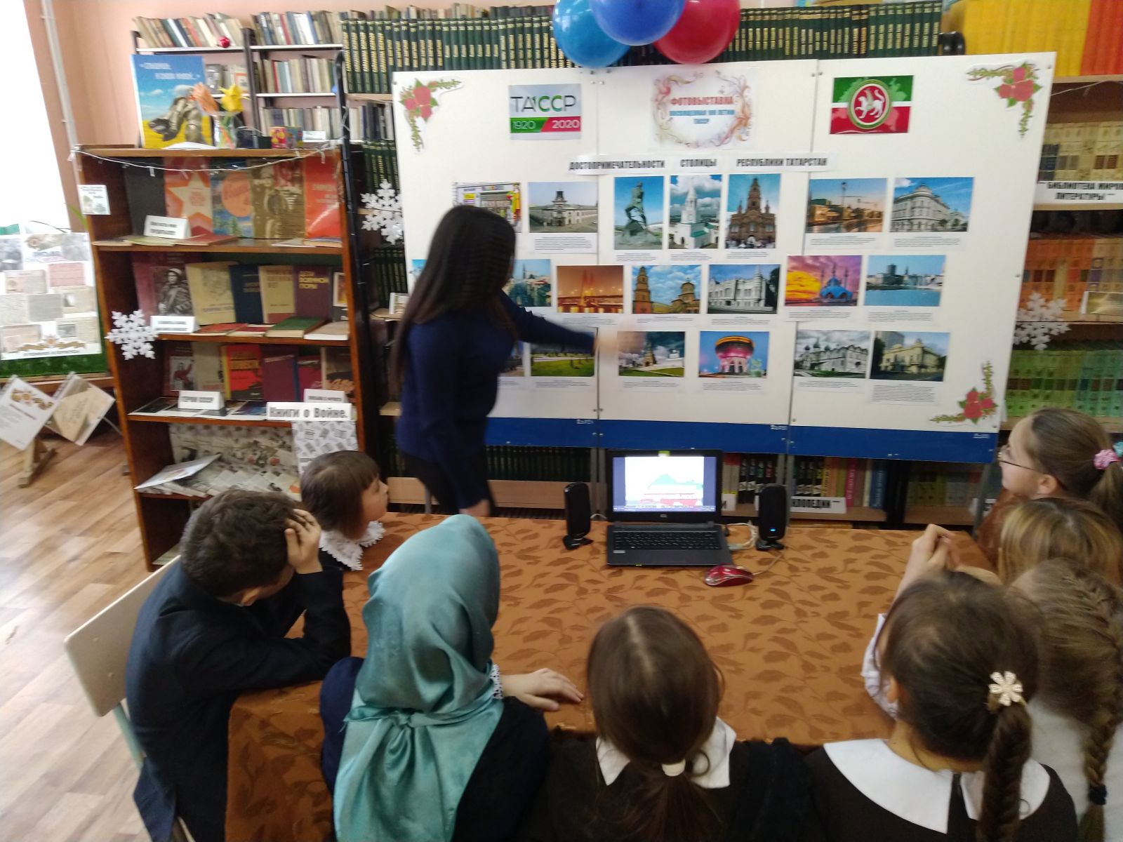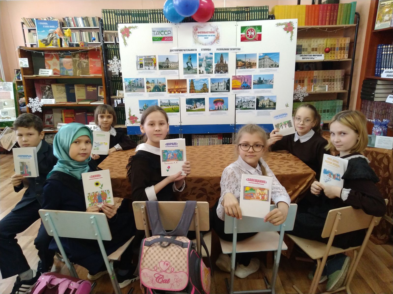 В школьной библиотеке с помощью фотовыставки ученики путешествовали по культурным учреждениям Казани, побывали в Булгаре, Биляре, Раифском монастыре и на острове Свияжск. Просмотрели интересный фильм об истории образования ТАССР. Библиотекарь познакомила учеников с книжной иллюстрированной выставкой «Родной край», в завершении ученики с удовольствием выбрали книги для домашнего чтения. -