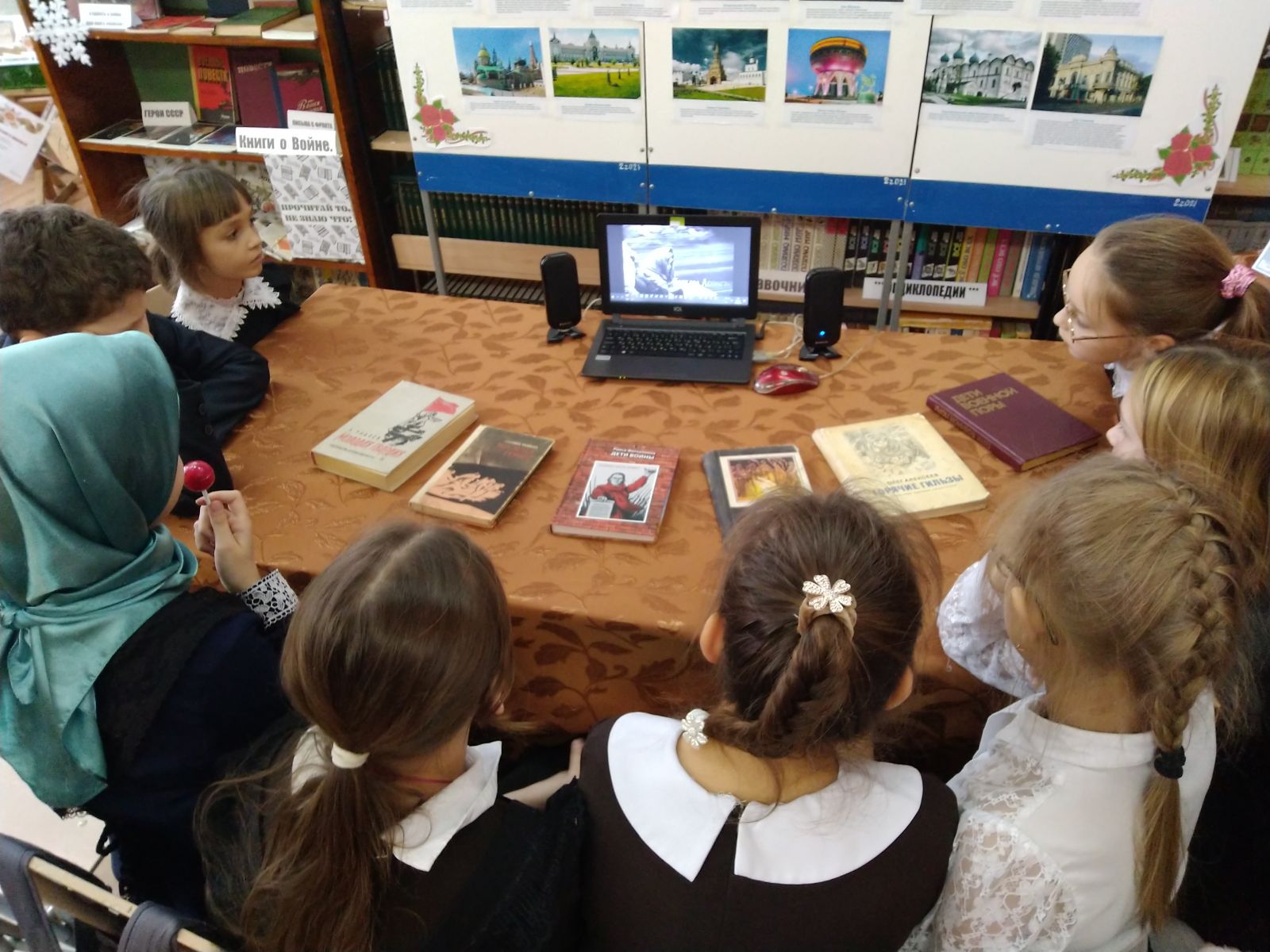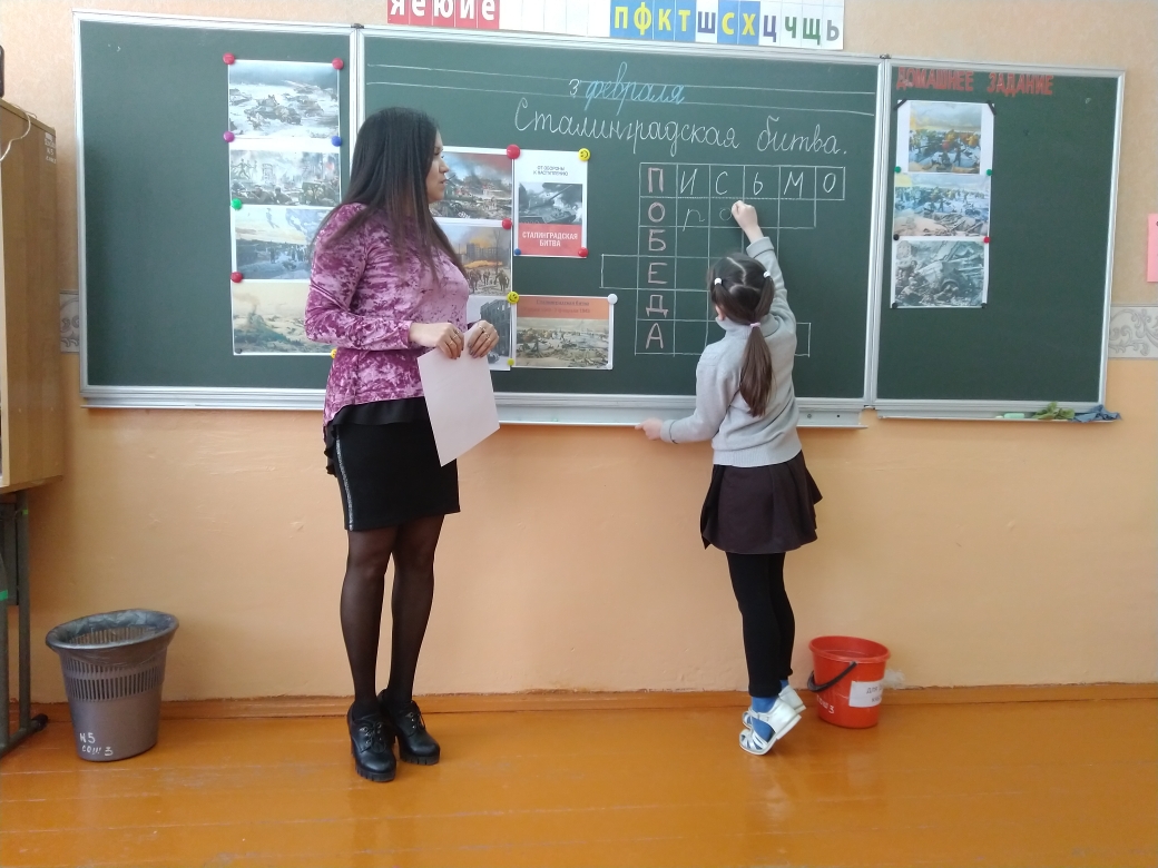 На уроке мужества во втором классе, в память о Сталинградской битве библиотекарь беседовала с ребятами о доблести и чести советского воина, о долге защиты Родины.Привела интересные исторические факты о том, что победа советских войск под Сталинградом над немецко-фашистскими войсками, одна из наиболее славных страниц летописи Великой Отечественной войны.200 дней и ночей — с 17 июля 1942 года по 2 февраля 1943 года — продолжалась Сталинградская битва при непрерывно возрастающем напряжении сил обеих сторон. На уроке просмотрели фильм «Сталинградская битва», после просмотра которого, дети рассказывали истории, воспоминания своих бабушек и дедушек, воевавших на войне.Также на уроке разгадывали кроссворд, посвященный войне. Дети с большим интересом участвовали на данном уроке, переживая каждую ситуацию связанную с войной. -