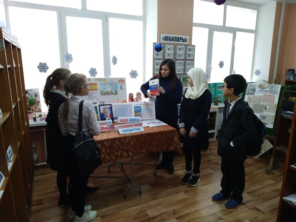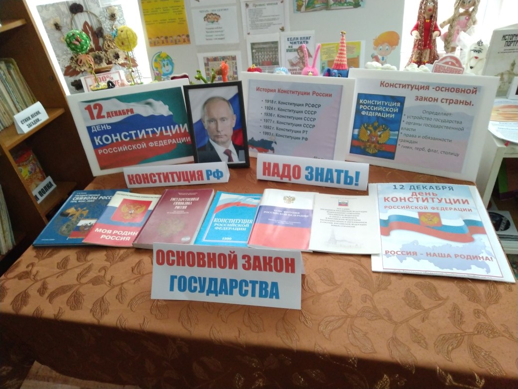 12 декабря – День Конституции Российской Федерации. К этому дню в школьной библиотеке подготовлена книжная выставка «Основной закон государства», где представлены информационные пособия об истории конституции, сама Конституция Российской Федерации, книги посвященные государственной символике России и другие материалы о правах и свободе человека. Конституция сама по себе представляет основу, фундамент для других отраслей права.