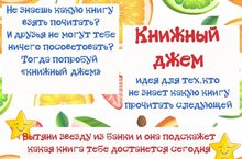 Порой юным читателям становится трудно сориентироваться в мире книг, и тогда на помощь приходит подсказка «Книжного джема»: из открытой баночки с яркой этикеткой нужно вытащить любую цветную бумажную звёздочку, на которой написаны автор и название книги. Каждый маленький читатель, пришедший в библиотеку, сможет найти для себя именно то, что нужно! Всех желающих отведать литературного угощения ждёт хорошее настроение, а самые активные читатели библиотеки будут приглашены на настоящее чаепитие с джемом и вареньем.