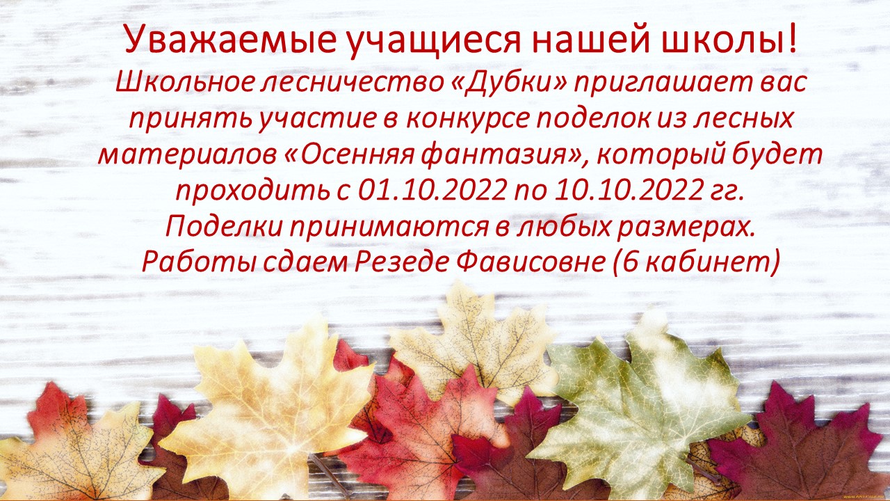 С 1 октября по 10 октября школьным лесничеством «Дубки» был организован конкурс поделок из лесных материалов «Осенняя фантазия». Сегодня были подведены итоги. Победители, призеры и участники были награждены грамотами. -