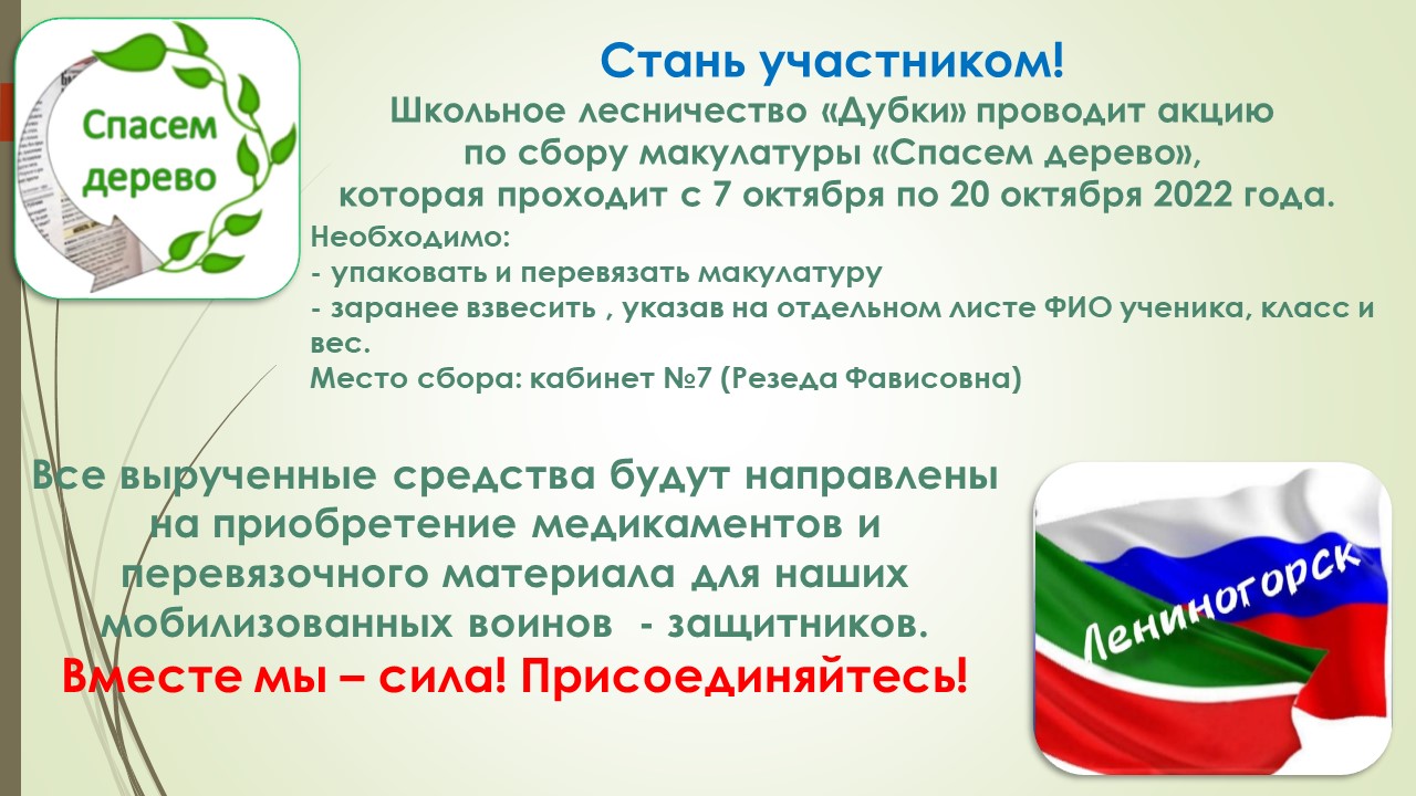 С 26 сентября по 19 октября 2022 года школьным лесничеством «Дубки» был организован сбор макулатуры. Приняли участие учащиеся всех классов.Результаты:1 место – 1 класс2 место – 3 класс3 место – 9 классНа вырученные средства в рамках гуманитарной помощи, приобрели медикаменты и перевязочный материал. -